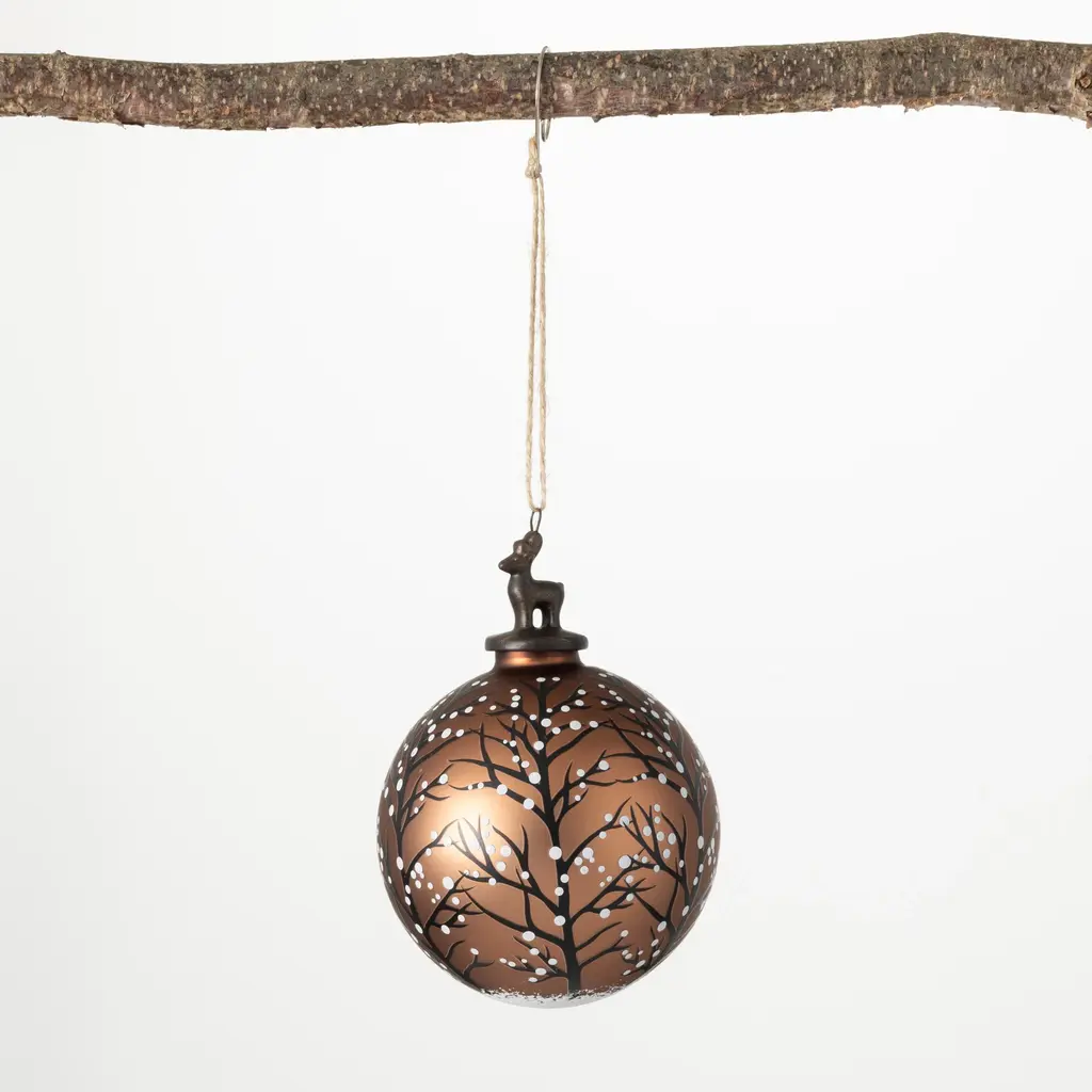 Bring some interest to your Holiday decorating with a beautiful brown ball Christmas ornament with a deer perched on top. The hand-painted detail on the ball features a winter tree in the midst of a snowfall. It makes a lovely addition to a woodland-themed Christmas and will have your guests taking a second look. Over the last 55 years, Sullivans has become an industry leader in home decorations. Our brand is rooted in tradition while incorporating modernized trends to keep your home looking up to date with timeless style. Here at Sullivans, we pride ourselves on creating product designs focused on quality and value, ensuring that our customers have access to beautiful products at reasonable price points. • Enhance your holiday decor with our exquisite Christmas ornament set, perfect for adorning your Christmas tree, wreaths, garlands, or even as elegant Christmas centerpiece table decorations • Made from premium quality material, our durable glass Christmas ornaments ensure longevity, preserving the beauty and sentimental value for years to come. • Not limited to just Christmas trees, these ornaments can be used creatively on wreaths, garlands, or as captivating Christmas centerpiece table decorations, allowing you to extend the holiday spirit throughout your home. • Add a rustic touch to your holiday theme with our unique brown Christmas ornaments, featuring a delightful deer design. These eye-catching decorations will bring a touch of natural beauty to your Christmas tree. • This Christmas ball ornament features a classic shape that brings a timeless elegance to your tree, making it the centerpiece of your festive celebrations. • This item is made of glass • Ornament measures 4"L x 4"W x 5.25"H