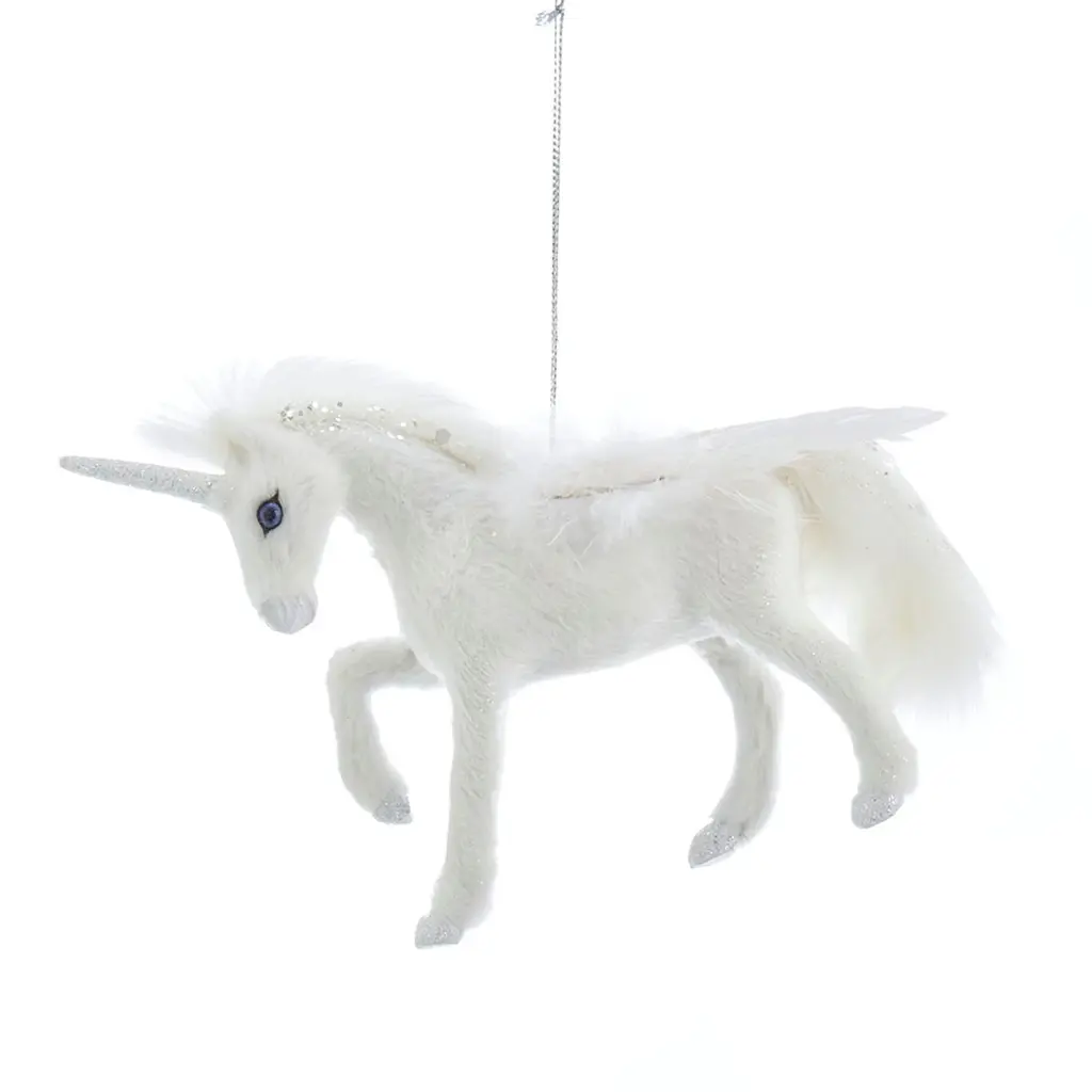 Add a touch of magic to your holiday season with this enchanting Unicorn Christmas ornament! Adorned with glitter, a shiny gold horn, and a rainbow tail and mane, this mythical creature will bring sparkle and joy to any holiday display. Hang it on your tree, wreath, or from your mantle and let the magic of the holiday season come to life. It is perfect for anyone who loves unicorns or appreciates whimsical and fantastical decor. Product Features: Unicorn hanging Christmas ornament White body embellished with glitter Rainbow striped mane and tail Shiny gold horn and hoofs Comes ready-to-hang on a white ribbon Fully dimensional ornament For indoor use only Dimensions: 3.75"H x 5.5"W x 1.5"D Material(s): glass