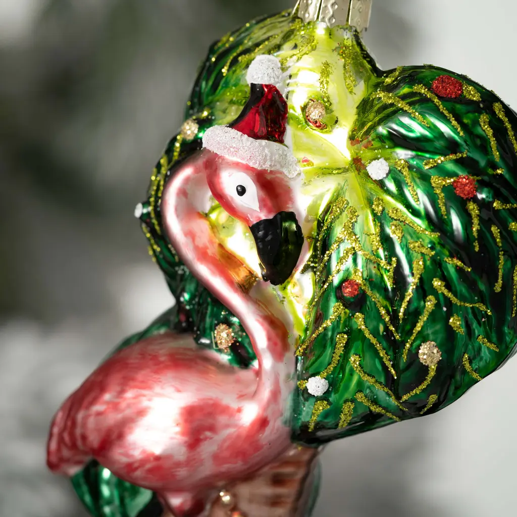 This iridescent flamingo ornament brings a touch of tropical whimsy to your Christmas decor. Add this unique ornament to your collection to bring a smile to your face each time you see its joyful pose. Whether displayed on your mantel, fireplace, or Christmas tree, this palm tree flamingo will instantly transport you to warmer climates and remind you to embrace the fun and wonder of the holiday season. • Tropical Flair: Add a touch of the tropics to your Christmas tree with our Flamingo Palm Tree Ornament, featuring vibrant pink flamingos and lush green palm trees for a fun and festive twist on traditional holiday decor. • Eye-Catching Design: Crafted from quality glass, this ornament showcases intricate details and vibrant colors, making it a standout piece on your Christmas tree or as part of your indoor holiday decorations. • Whimsical Charm: With its playful design and cheerful colors, this ornament brings a sense of whimsy and joy to your holiday festivities, capturing the spirit of the season in a delightful way. • Versatile Usage: Whether hung on the tree, displayed in a holiday centerpiece, or used as part of a festive tabletop arrangement, our Flamingo Palm Tree Ornament adds a unique and festive touch to any indoor Christmas decor. • Holiday Cheer: Perfect for adding a pop of color and personality to your Christmas tree or holiday decor, this charming ornament is sure to spread joy and cheer throughout your indoor living space during the holiday season. • Experience Timeless Elegance with Sullivan's Home Decor - Celebrating Over 55 Years of Excellence! Explore our extensive collection of quality products, meticulously curated to suit every style, season, and occasion. From classic designs to on-trend accents, Sullivan's Home Decor seamlessly blends tradition with modernity, ensuring there's something special for everyone. Transform your living spaces with our enduring commitment to style and sophistication. • Ornament measures 2.75"L x 1.5"W x 5.5"H