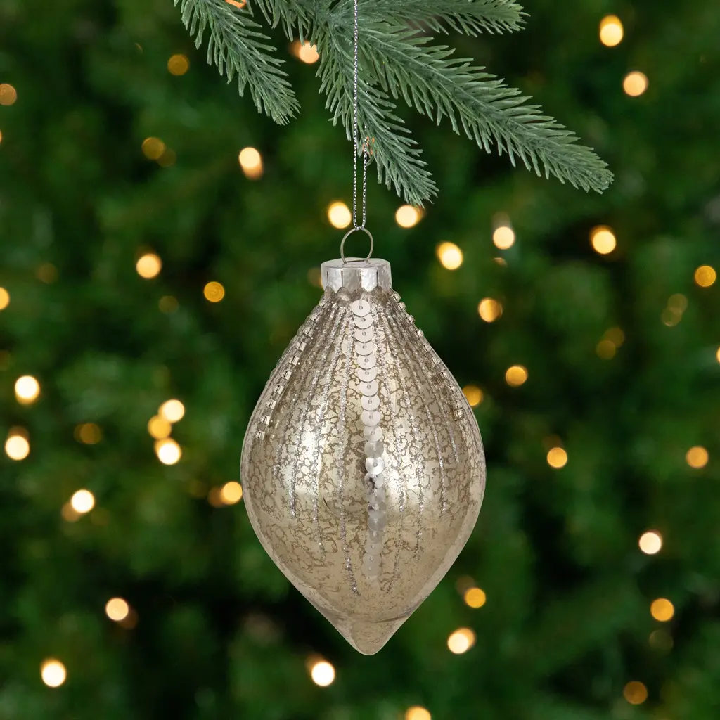 This simple and elegant mercury glass ornament will be a striking addition to your Christmas decor. This gold finial ornament is accented with gold glitter and sequins and will add the perfect amount of sparkle to your tree. This timeless piece will be part of your holiday year after year. Product Features: Gold finial glass ornament. Embellished with gold glitter and seqiuns. Comes ready to hang on a gold cord. For indoor use only. Dimensions: 5" high x 3.25" diameter. Materials: glass