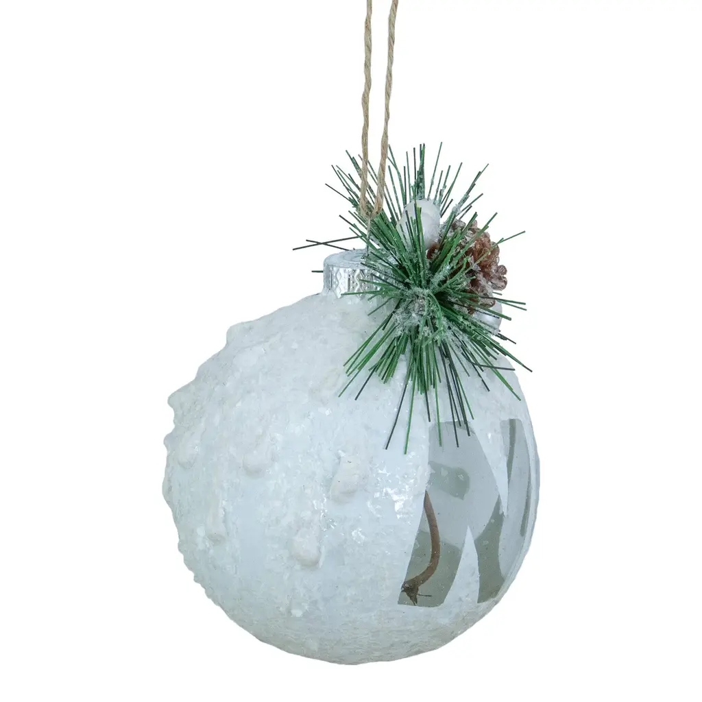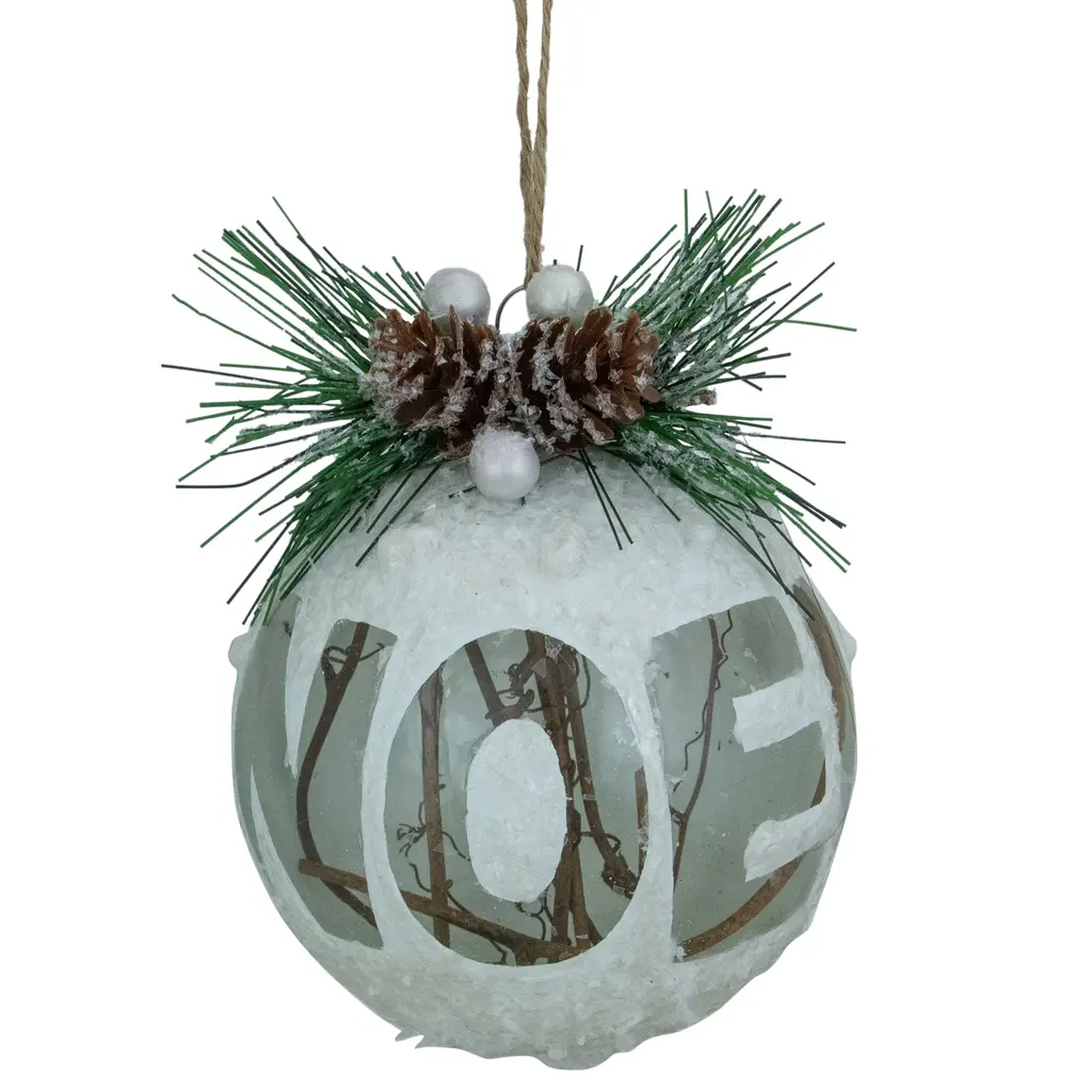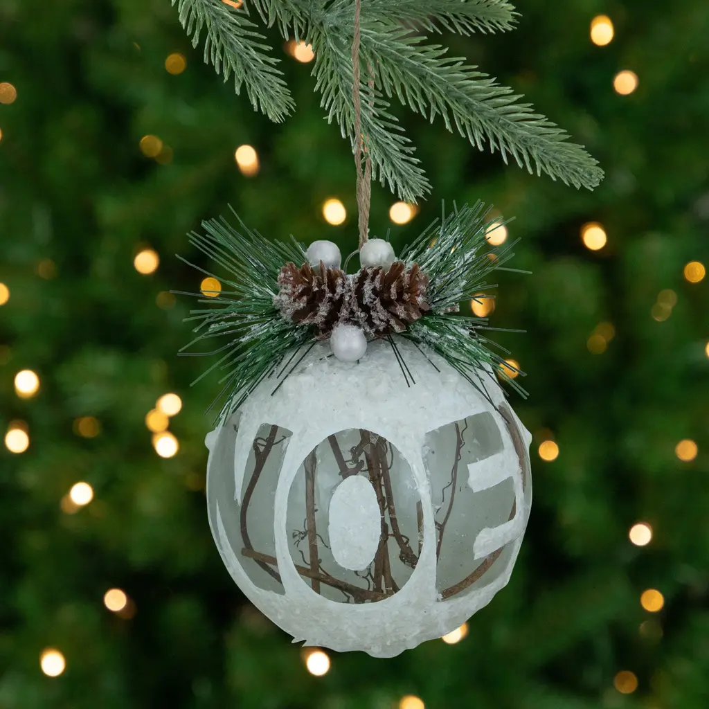 A simplistic nod to Christmas the Noel holly and berry ornament celebrates classic traditions of the season. Features a white frosted glass ball ornament with the word "NOEL" the best part is you can see directly through the ornament where lies artificial twigs. Pine cones and needles top off this amazing ornament. Perfect for your tree season after season. Product Features: Reads "NOEL". Brown branch design. Frosted with large glitter flakes. Pine needle and pine cone accents. Comes ready to hang on a jute cord. For indoor use only. Dimensions: 5"H x 4"W x 4"D. Materials: Glass/plastic