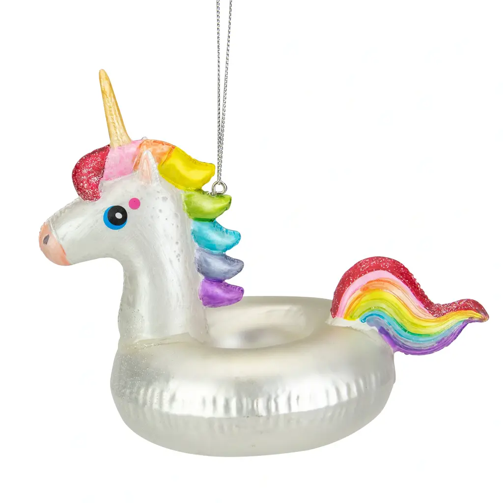 6.5" Rainbow Unicorn Pool Float Glass Christmas Ornament - White
