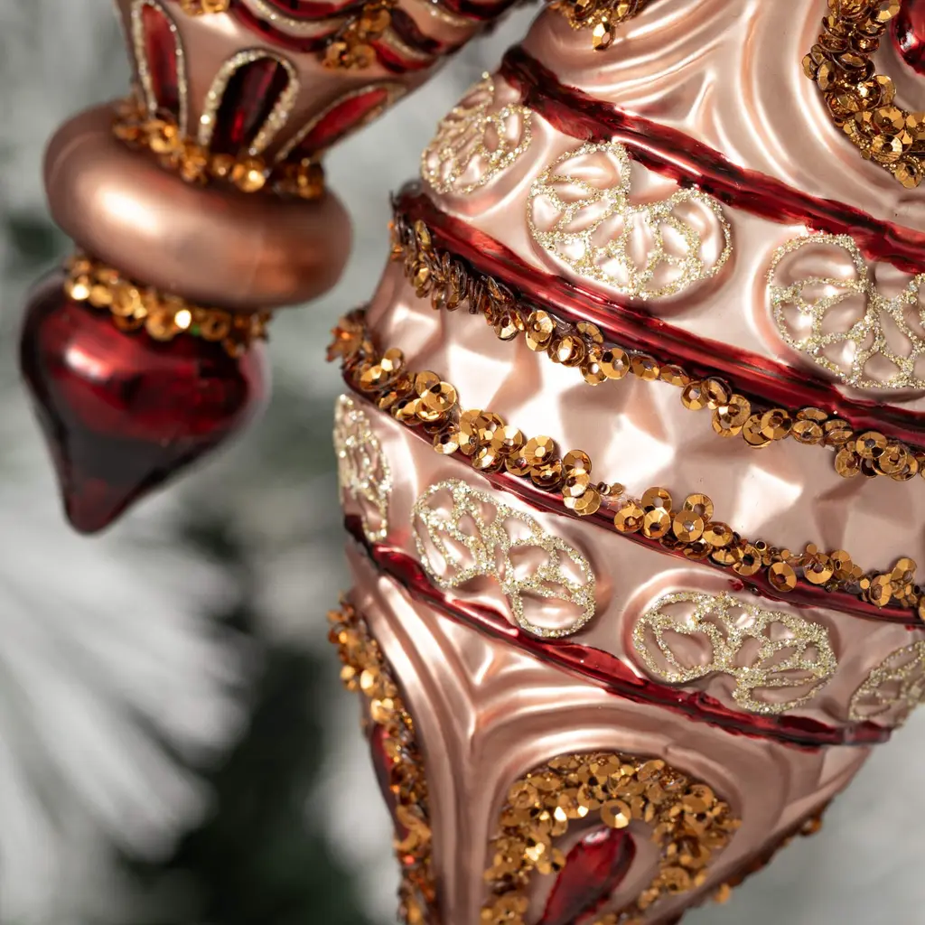 These festive encrusted ornaments make decorating for Christmas truly fit for a king. Exclusive to Sullivans Home Decor, the two large ornaments are encrusted with dazzling gems in a strikingly bold design that will elevate any tree. With their sizeable dimensions and gemstone encrustment, these ornaments bring maximum impact while keeping things concise and direct. Make this Christmas truly memorable by decorating with these exquisitely crafted dazzling ornaments. • Luxurious Design: Elevate your holiday decor with our Encrusted Opulent Ornament Set, featuring intricately designed ornaments that exude opulence and elegance. • Ideal Size: Each ornament measures 6 inches tall, 3 inches wide, and 3 inches long, making them perfect for showcasing on your Christmas tree or incorporating into your ornaments set. • Exquisite Craftsmanship: Crafted from high-quality glass, these ornaments boast exquisite detailing and are adorned with shimmering red-gold accents, adding a touch of luxury to your indoor Christmas decor. • Rich Color Palette: The rich red-gold color scheme of these ornaments creates a warm and inviting ambiance, making them perfect for complementing traditional Christmas themes or adding a regal touch to any space. • Versatile Decor Options: Whether hung on your Christmas tree, displayed in a decorative bowl, or used to adorn garlands and wreaths, our Encrusted Opulent Ornament Set offers endless possibilities for enhancing your indoor Christmas decor. • Experience Timeless Elegance with Sullivan's Home Decor - Celebrating Over 55 Years of Excellence! Explore our extensive collection of quality products, meticulously curated to suit every style, season, and occasion. From classic designs to on-trend accents, Sullivan's Home Decor seamlessly blends tradition with modernity, ensuring there's something special for everyone. Transform your living spaces with our enduring commitment to style and sophistication. • Ornaments measure 3"L x 3"W x 6"H, 3.25"L x 3.25"W x 6.5"H