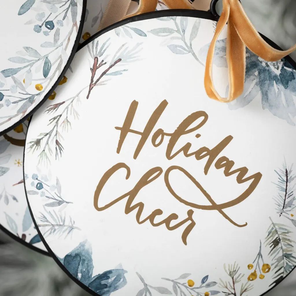 Deck the halls and your mantle with this elegant set of three metal disk ornaments. Each white disk features subtle blue accents and refined gold text with a holiday message perfect for the season. Whether you choose "joy," "holiday Cheer," or "merry and Bright," these exclusive ornaments from Sullivans Home Decor add a touch of traditional charm. Large enough to catch your eye, they make a stylish statement without taking up too much space. Hang them individually or in a cluster - either way, the refined natural tones and messages are certain to spread holiday cheer. • Charming Holiday Messages: Our Holiday Text Disc Ornaments feature cheerful seasonal phrases and designs, adding a festive touch to your Christmas decorations. • Generous Size: Each ornament measures 6.5 inches tall, 0.75 inches wide, and 6 inches long, making them noticeable on your tree while still fitting seamlessly into your indoor holiday décor. • Durable Metal Construction: Crafted from high-quality metal, these ornaments are built to last, ensuring they maintain their vibrant colors and delightful designs for seasons to come. • Multicolor Design: With their vibrant multicolor design, these ornaments bring a pop of color to your Christmas tree, enhancing its visual appeal and creating a joyful atmosphere in your home. • Complete Set: This set includes a variety of Holiday Text Disc Ornaments, allowing you to mix and match or create themed sections on your tree, making it easy to achieve the perfect festive look. • Experience Timeless Elegance with Sullivan's Home Decor - Celebrating Over 55 Years of Excellence! Explore our extensive collection of quality products, meticulously curated to suit every style, season, and occasion. From classic designs to on-trend accents, Sullivan's Home Decor seamlessly blends tradition with modernity, ensuring there's something special for everyone. Transform your living spaces with our enduring commitment to style and sophistication. • Ornaments measure 6"L x .75"W x 6.5"H