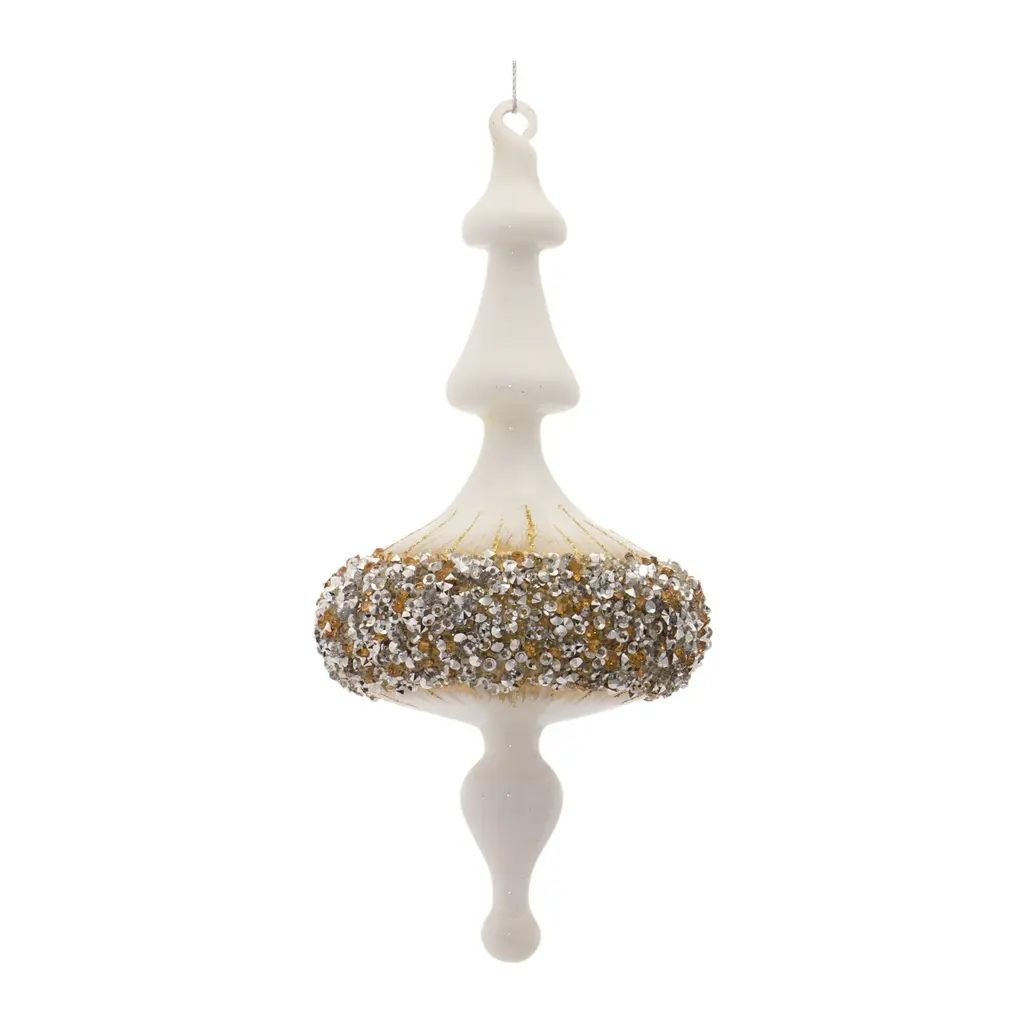 Enhance your Christmas tree with our exquisite finial drop ornaments. With two assorted designs, these ornaments combine traditional elegance with a touch of glamour. The chic white and gold tones, adorned with delicate beaded accents, elevate your holiday decor. Whether as cherished gifts or for personal enjoyment, this set brings timeless beauty to your festive celebrations. Don't miss out on this stunning addition for years of joyful holiday memories. Product Features: 6-piece set Color: white and gold Finish: matte Ornaments come ready-to-hang on silver cord Chic white and gold tones with beaded accents Perfect for any Christmas themed parties or decoration For indoor use only Dimensions: Small: 8" high x 3.5" diameter Large: 8.25" high x 3" diameter Material(s): glass Notes:Pack includes 2 of each item shown for a total of 6 pieces