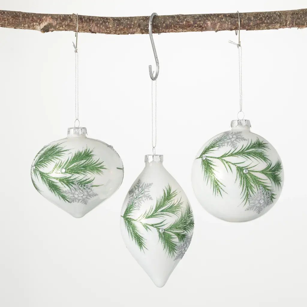 Add a touch of class to your holiday decor this Christmas season with this set of botanical inspired drop ornaments. Elegantly exquisite, these ornaments feature an intricate green botanical design over a white background for a vibrant look. Great for gift giving and creating memories with family and friends. Over the last 55 years, Sullivans has become an industry leader in home decorations. Our brand is rooted in tradition while incorporating modernized trends to keep your home looking up to date with timeless style. Here at Sullivans, we pride ourselves on creating product designs focused on quality and value, ensuring that our customers have access to beautiful products at reasonable price points. • This set of 3 Christmas ornaments adds a touch of elegance and charm when placed strategically on your tree, creating a festive atmosphere for the holiday season. • Crafted from high-quality glass, these ornaments are built to last, ensuring that you can enjoy their beauty for many Christmases to come. • Not limited to just Christmas trees, these ornaments can be used creatively on wreaths, garlands, or as captivating Christmas centerpiece table decorations, allowing you to extend the holiday spirit throughout your home. • The enchanting combination of white with delicate green botanical designs and shimmering silver snowflakes adds a touch of sophistication and elegance to your holiday decor, making your tree stand out from the rest. • This ornament set features a diverse range of shapes, including a classic ball, graceful drop, and charming orb. Each shape adds its own unique charm to your Christmas tree, creating a visually stunning display that will impress family and friends. • This item is made of glass • Ornaments measure 4"L x 4"W x 4"H, 4"L x 4"W x 4"H, 3"L x 3"W x 6"H