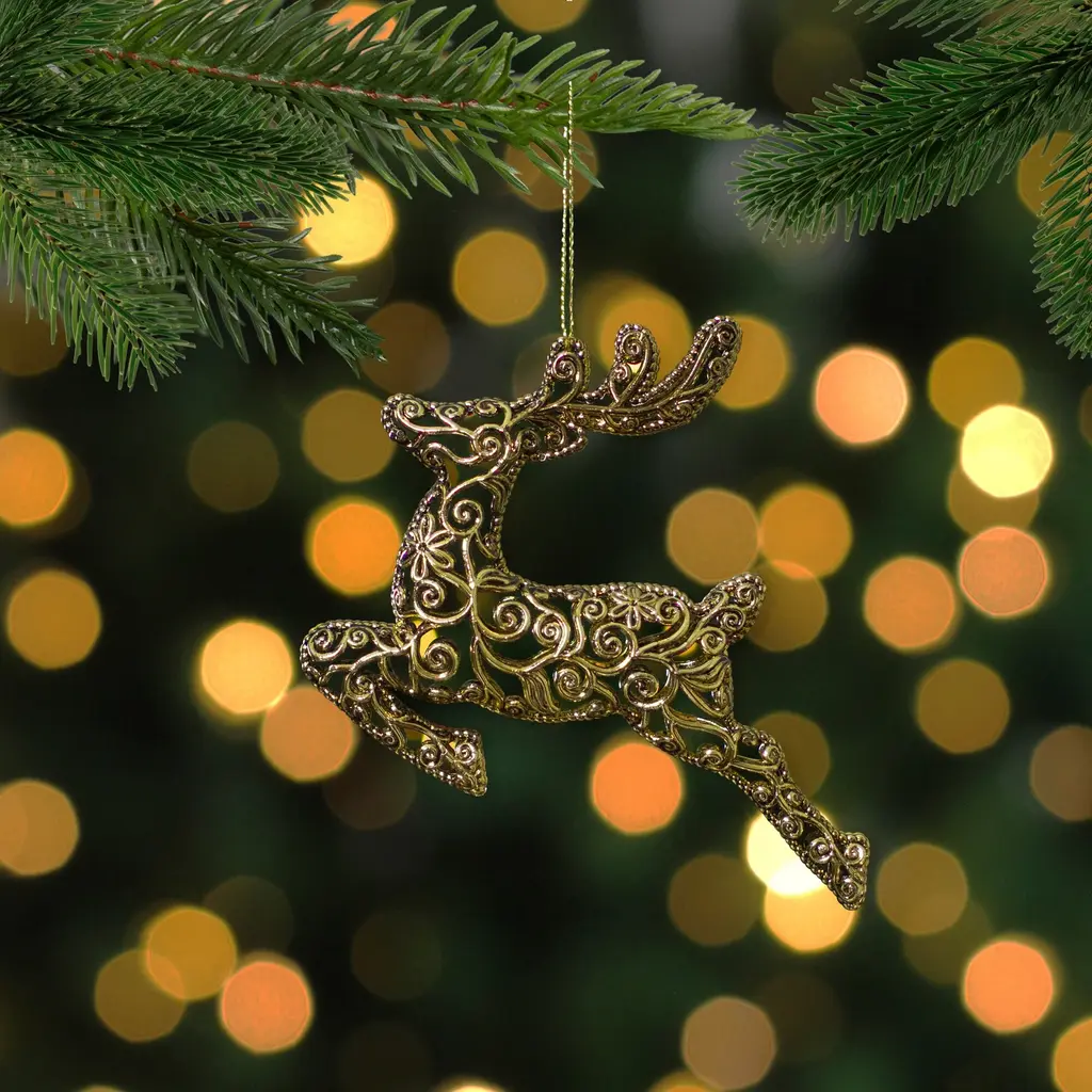 This intricate gold leaping reindeer Christmas ornament is a beautiful addition to your tree this year. The enchanting design will stand out and create the perfect ambiance for your special holiday season. Product Features: Features an elegant filigree style design. Deer is positioned in a leaping position. Double-sided ornament. For indoor use only. Comes ready-to-hang on a gold cord. Dimensions: 6"H x 7"W x 1.5"D. Material(s): plastic