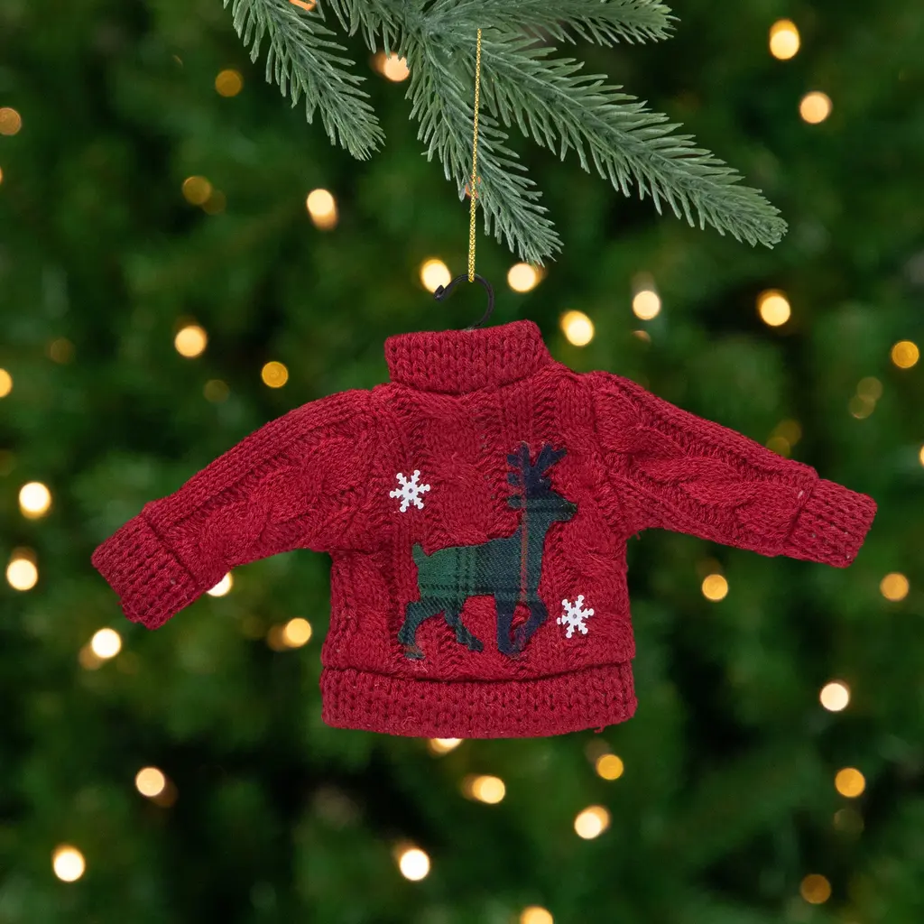 This holiday sweater ornament makes a great addition to any Christmas tree. You'll love its festive design featuring a plaid reindeer in the center and accented with two white snowflakes. Perfect to hand out to family or friends put into holiday gift bags or stockings. This ornament will look great as an added decoration on your wrapped Christmas gifts! Product Features: Red reindeer Christmas sweater ornament. Features a black and green plaid reindeer design. Accented with two white snowflakes. Fully dimensional ornament. Attached to a black hanger to place on your tree. For indoor use only. Dimensions: 4.5"H x 8"W x 2"D. Materials: fabric/metal/plastic