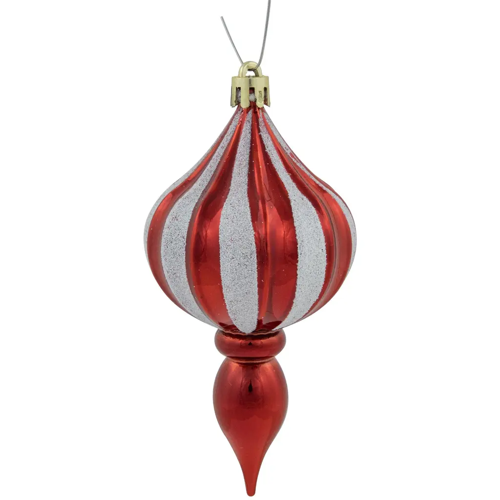 Finial ornaments are one of a kind! An unique shape in classic colors. The ornaments are equipped with ornament caps and come ready to hang from an attached cord. The beautiful finish provides the perfect amount of sparkle to your tree. Shatterproof ornaments combine the beauty and luster of real glass with the unbreakable practicality of plastic. Product Features: 8-piece set Color: red and white Finish: shiny Fully dimensional ornament Finials are equipped with ornament caps Ornaments come ready-to-hang on gold cords Dimensions: 4.75" High x 2.5" Wide