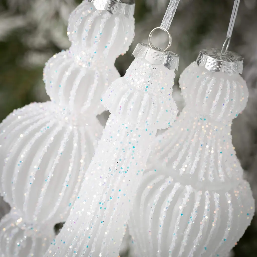 These opaque white finial ornaments are the perfect neutral addition to your Christmas decor. The ribbed design provides subtle texture while remaining sleek and understated, so they will complement any neutral holiday display. Impressive in size, this trio of ornaments can be used are versatile enough to match your unique Christmas style. The simple yet striking design means these three ornaments will stand the test of time for years of seasonal decorating. • Elegant Opaque White Design: Elevate your holiday décor with our Opaque White Finial Ornaments, featuring a classic and sophisticated aesthetic that complements any Christmas theme. • Generous Size: Standing at 9 inches tall, with a width and length of 2.75 inches, these ornaments make a statement on your Christmas tree or as part of your indoor holiday display. • Premium Glass Construction: Crafted from high-quality glass, these ornaments boast durability and a smooth finish, ensuring they remain a cherished part of your holiday collection for years to come. • Versatile Décor Accent: The timeless white color scheme of these finial ornaments makes them versatile for various decorating styles, from traditional to modern, adding a touch of elegance to your indoor Christmas décor. • Complete Your Collection: Whether hung on the tree or displayed around your home, this set of ornaments provides the perfect finishing touch to your Christmas decorations, offering a cohesive look to your festive ensemble. • Experience Timeless Elegance with Sullivan's Home Decor - Celebrating Over 55 Years of Excellence! Explore our extensive collection of quality products, meticulously curated to suit every style, season, and occasion. From classic designs to on-trend accents, Sullivan's Home Decor seamlessly blends tradition with modernity, ensuring there's something special for everyone. Transform your living spaces with our enduring commitment to style and sophistication. • Ornaments measure 2.75"L x 2.75"W x 9"H, 2.75"L x 2.75"W x 8"H, 2.5"L x 2.5"W x 8"H