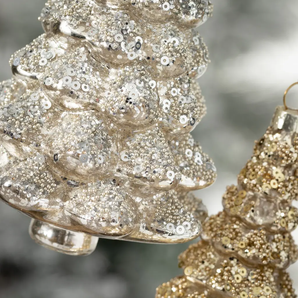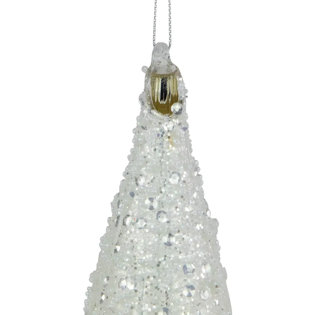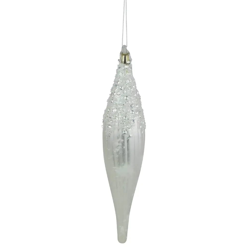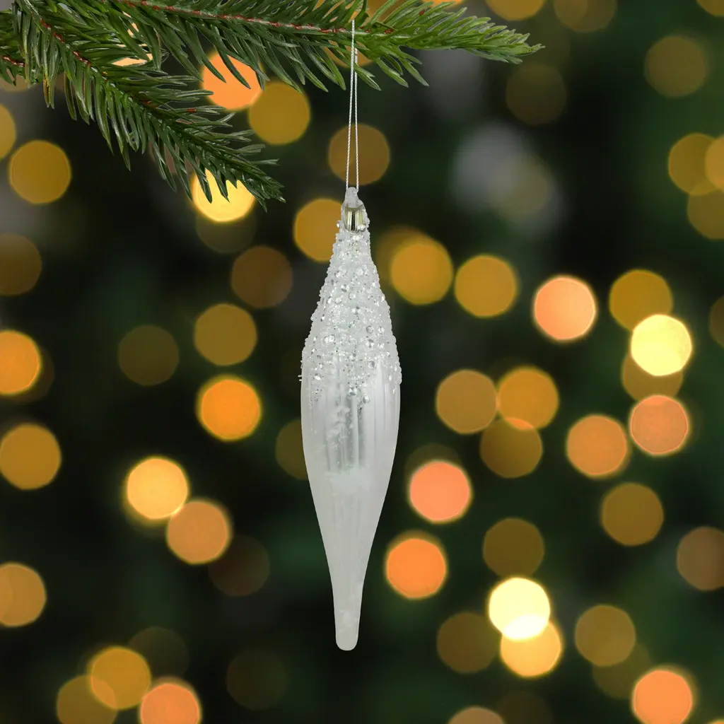 Add a sparkling touch to your Christmas tree with this sequin and glitter finial glass Christmas ornament. Made of high-quality glass this ornament features a matte white finish and is adorned with intricate sequin and glitter detailing. Its icicle shape adds a classic touch to your holiday decor while its size makes it a perfect statement piece for larger trees. Hang it on your tree with the attached silver string for an elegant and festive look that will be sure to catch everyone's eye. Product Features: Finial Christmas ornament. The matte white finish provides a modern touch while the sequins and glitter add a festive sparkle. A sizable decoration that can stand out on any Christmas tree. Fully dimensional ornament. Comes ready-to-hang on a silver cord. Recommended for indoor use only. Dimensions: 9.5" high by 2" diameter. Material(s): glass