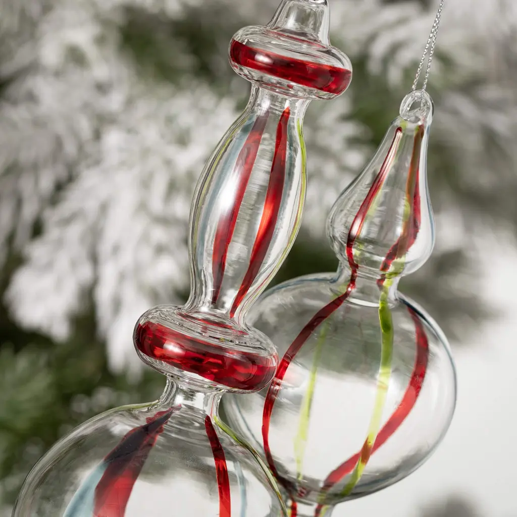 These whimsical glass ornaments are exclusive to Sullivans Home Decor and perfect for adding some cheer this holiday season. The two clear finials are striped with bright, cheery colors in a simple yet eye-catching design-- easy additions to any Christmas tree or mantel. Top your holiday decor with these playful yet sophisticated striped finial ornaments and watch as their simple clear and colored stripes elevate any festive scene. • Elegant Design: Elevate your Christmas tree décor with our Clear Striped Finial Ornaments, featuring a sleek and sophisticated design with red and green stripes that add a festive touch to any setting. • Generous Size: Standing tall at 9.5 inches with a width and length of 2.75 inches, these ornaments make a striking statement on your tree, mantel, or holiday centerpiece. • High-Quality Construction: Crafted from premium glass, these finial ornaments boast durability and shine, ensuring they withstand the test of time and become cherished pieces in your ornament collection. • Versatile Decorating: Whether used individually or as part of a coordinated ornaments set, these Clear Striped Finials complement a variety of Christmas décor themes, from traditional to contemporary. • Festive Color Scheme: The classic red and green colors evoke the spirit of the holiday season, making these ornaments perfect for adding a pop of color and elegance to your indoor Christmas decorations. • Experience Timeless Elegance with Sullivan's Home Decor - Celebrating Over 55 Years of Excellence! Explore our extensive collection of quality products, meticulously curated to suit every style, season, and occasion. From classic designs to on-trend accents, Sullivan's Home Decor seamlessly blends tradition with modernity, ensuring there's something special for everyone. Transform your living spaces with our enduring commitment to style and sophistication. • Ornaments measure 2.75"L x 2.75"W x 9.5"H, 2.25"L x 2.25"W x 9"H