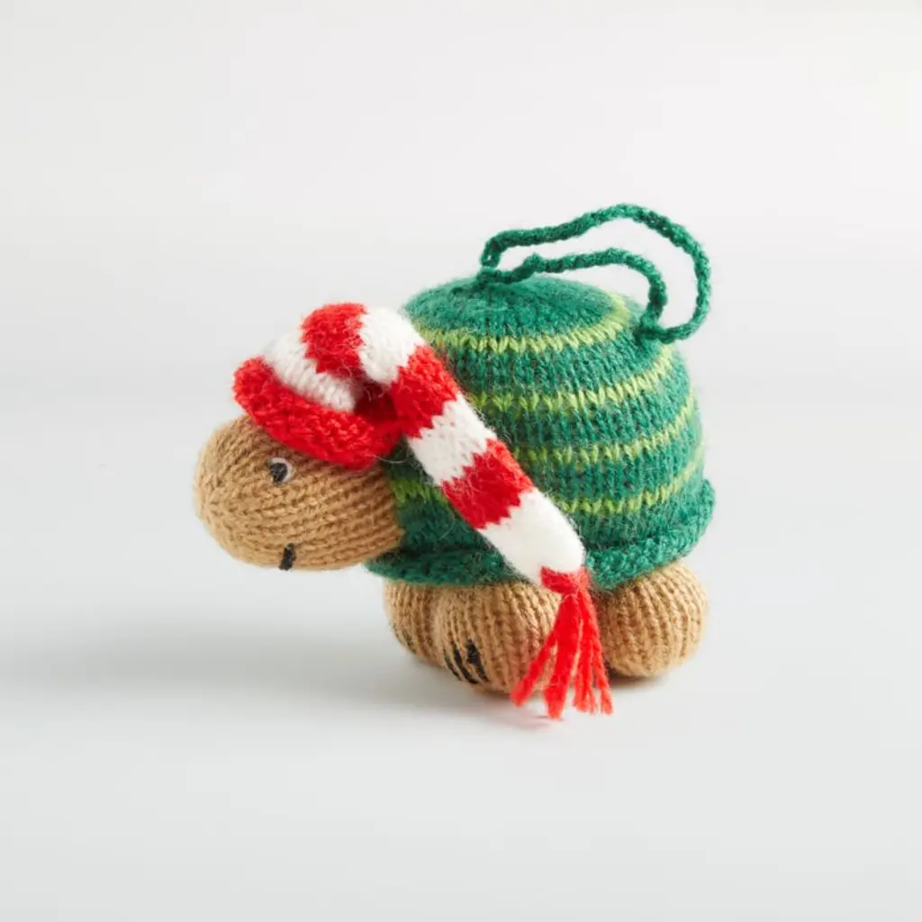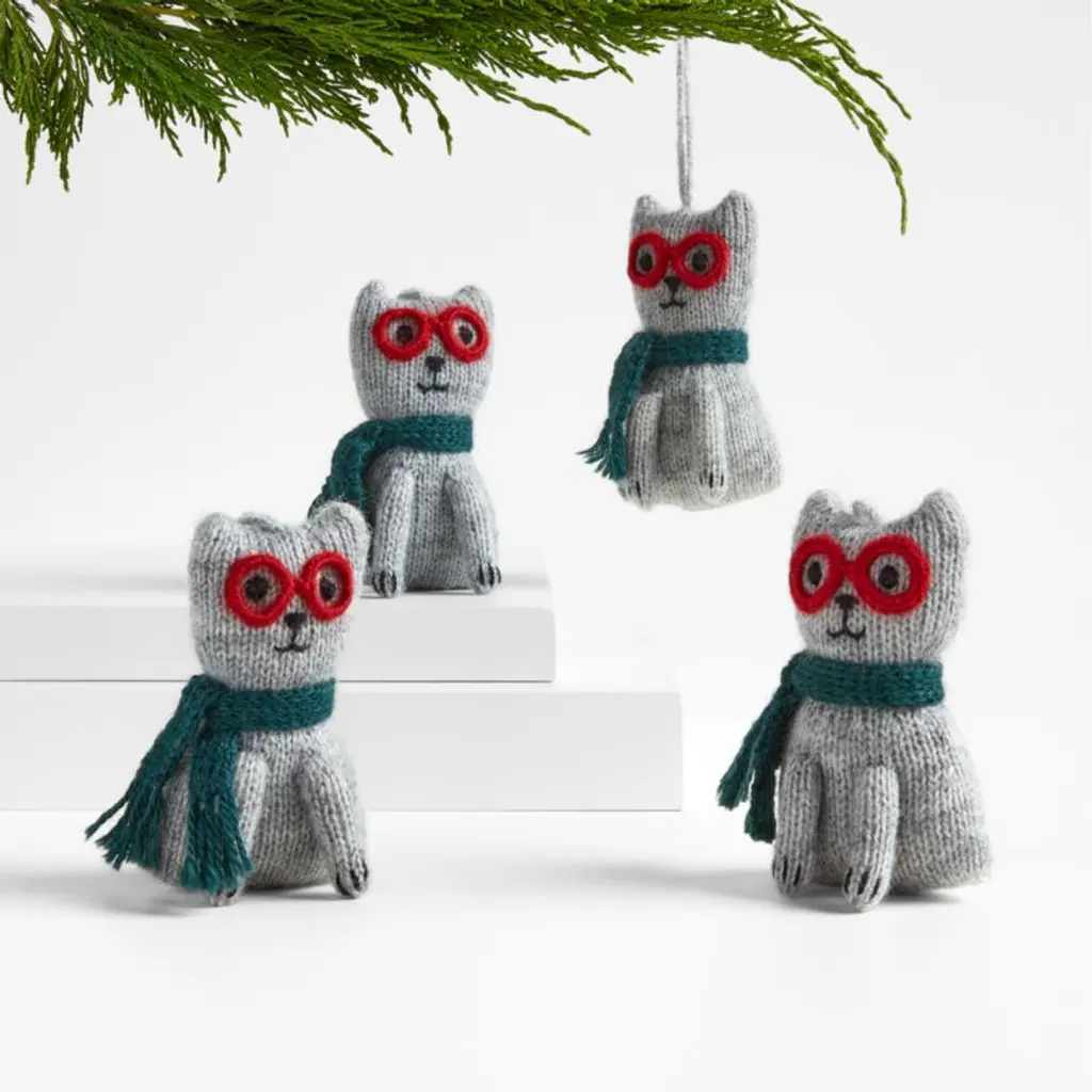 Artisanal and downright delightful, our cat Christmas ornament is handknit from super-soft alpaca-blend yarn. Sporting a pine green muffler and oversized red glasses, this grey feline adds a fashion-forward sense of whimsy to your holiday tree. Part of our exclusive alpaca tree decoration collection, the cat ornament makes up a charming menagerie along with its companion animal and snowman ornaments.