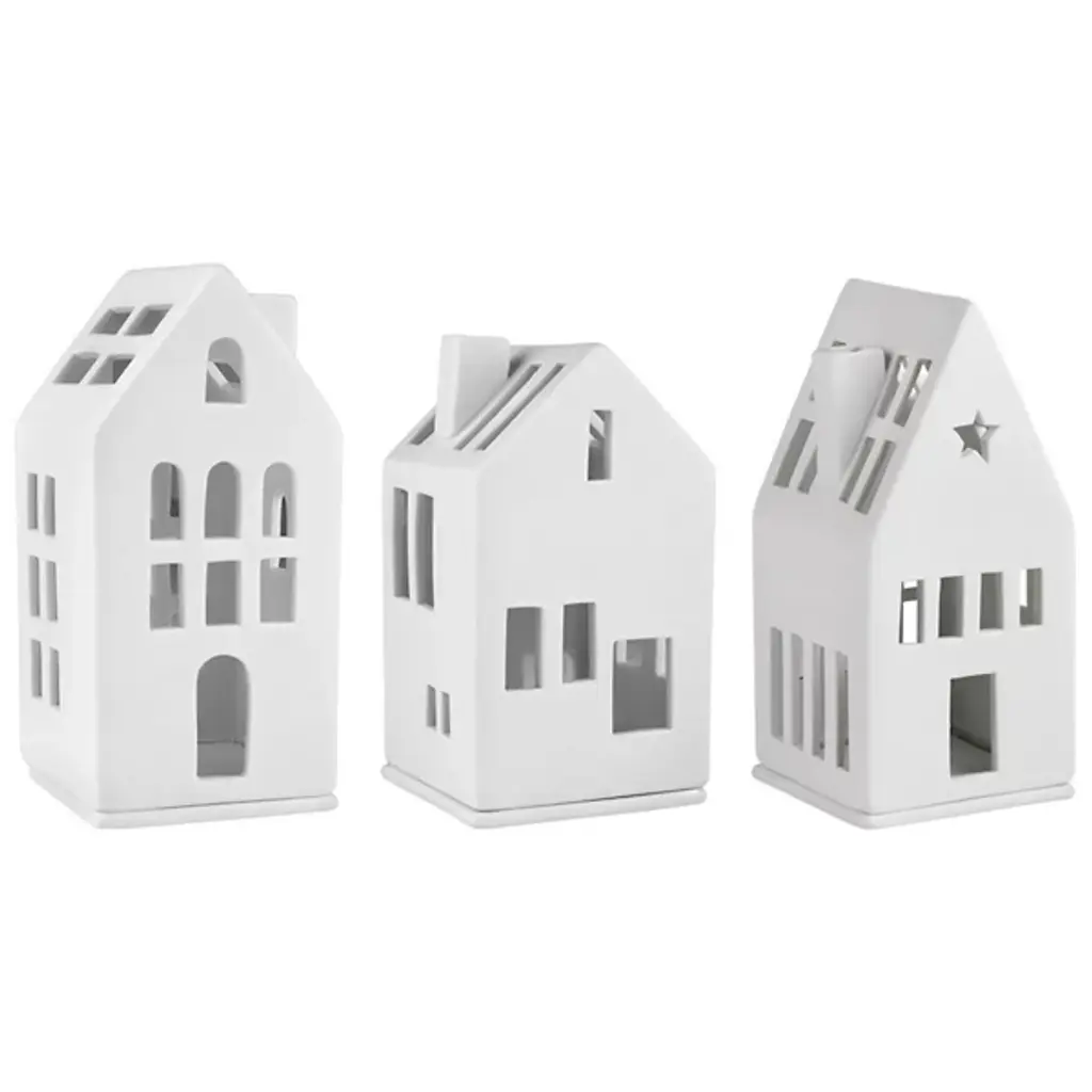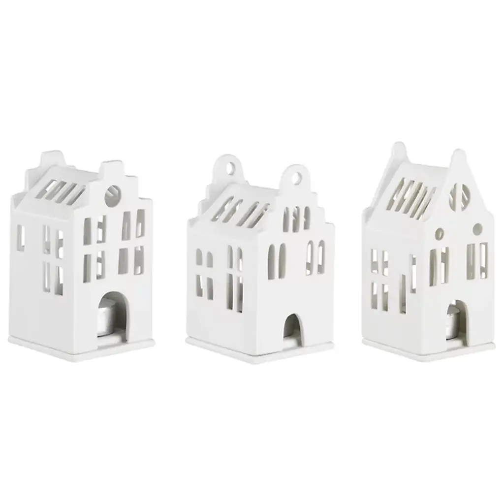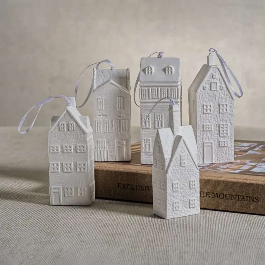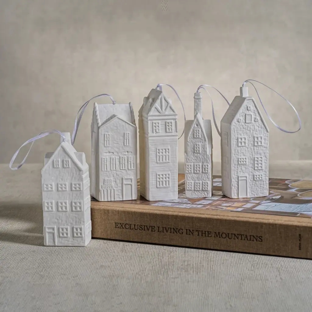 The Amsterdam Assorted House Ornaments are crafted from fine bone china with a clean, crisp white finish. These Dutch canal-style house figurines make charming holiday hanging ornaments, adding a touch of elegance and cultural flair to your festive decorations.