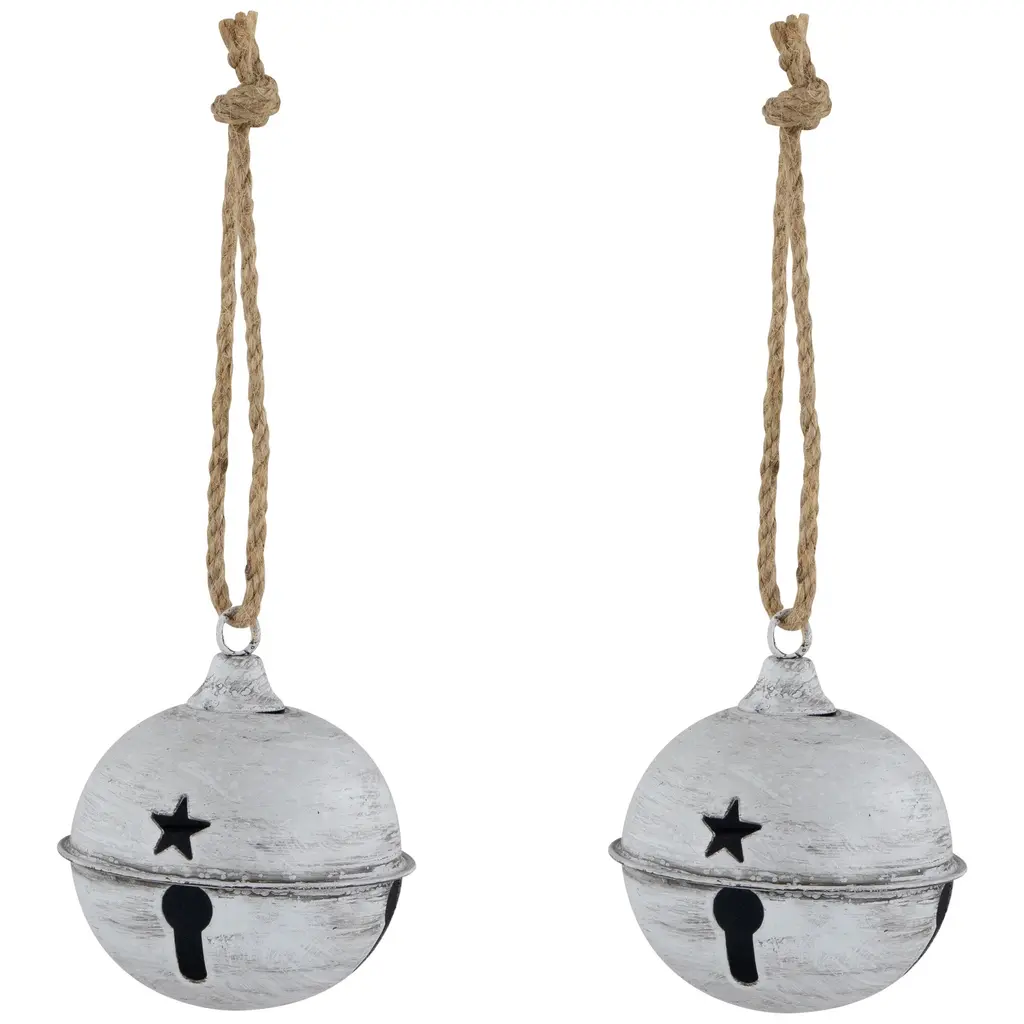 Ring in the holidays with a touch of vintage charm. This set of jingle bell ornaments boasts a classic 3-inch diameter and a beautiful antiqued white finish. The distressed look adds a touch of rustic elegance perfect for farmhouse or vintage-inspired Christmas decor. Each jingle bell produces a delightful chime ready to fill your home with nostalgic Christmas cheer. Hang them on your tree garland wreath or anywhere that needs a touch of winter magic. Features: Christmas jingle bell ornaments Set of 2 have a shiny white finish Brush stokes provide an antiqued look Designed with star and keyhole cutouts Includes a jute rope for hanging For indoor use only Dimensions: 3"H x 3"W x 3"D With rope: 7" high Material(s): metal/jute