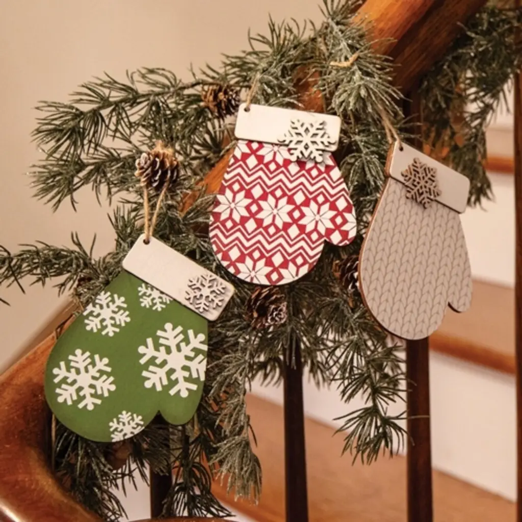 Specification:DescriptionDecorate your space with the Snowflake Mitten Ornaments, crafted from durable wood and designed to bring a cozy touch to your holiday decor. These charming ornaments come in three unique designs: a green mitten showcasing a white snowflake cutout, a red mitten featuring a geometric Fair Isle pattern, and a beige mitten with a knit-look texture. Each ornament is equipped with a jute string for easy hanging, making them perfect for trees, wreaths, or as festive accents around your home. Enhance your seasonal decorations with these stylish mitten ornaments that capture the spirit of winter.