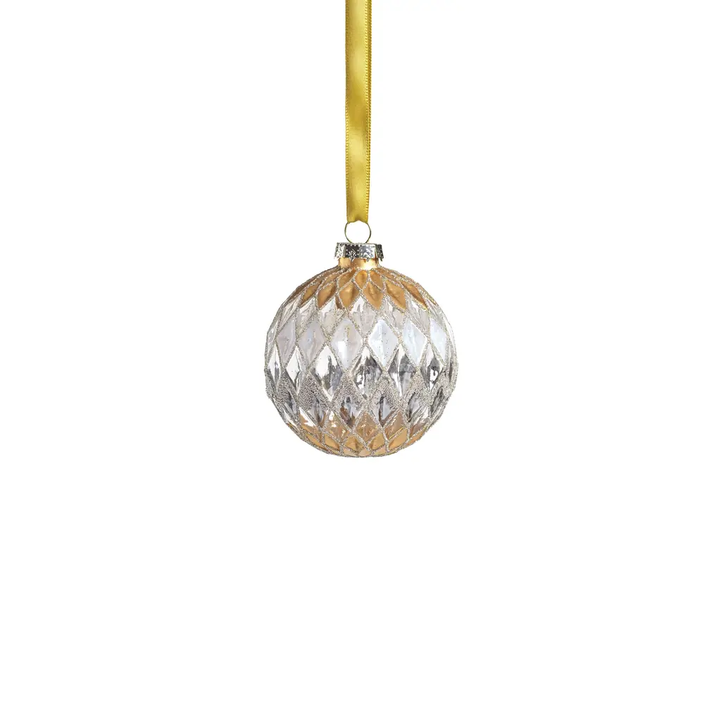Lend a modern carnival sparkle to your Christmas tree with this stylish diamond design cut glass ball. Each ornament features the popular harlequin pattern with dazzling diamonds. Full of elegance, this pretty Christmas ornament will bring style to your holiday decor. Features: Set of 6 ball ornaments of the same size Diamond pattern lined with glitters Equipped with gold ornament cap Each comes with a string to make it easier to hang Perfect addition to your holiday tree decor Clean with a soft dry cloth