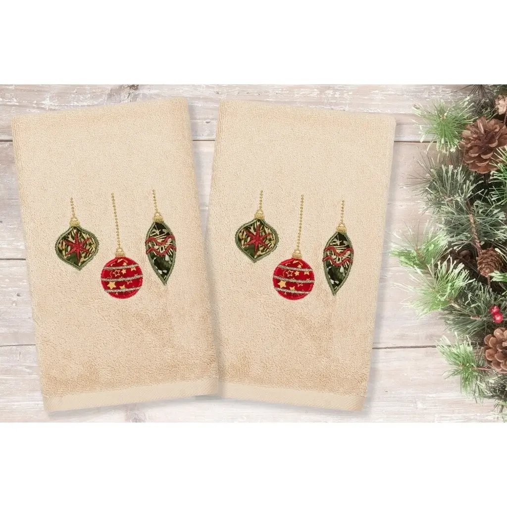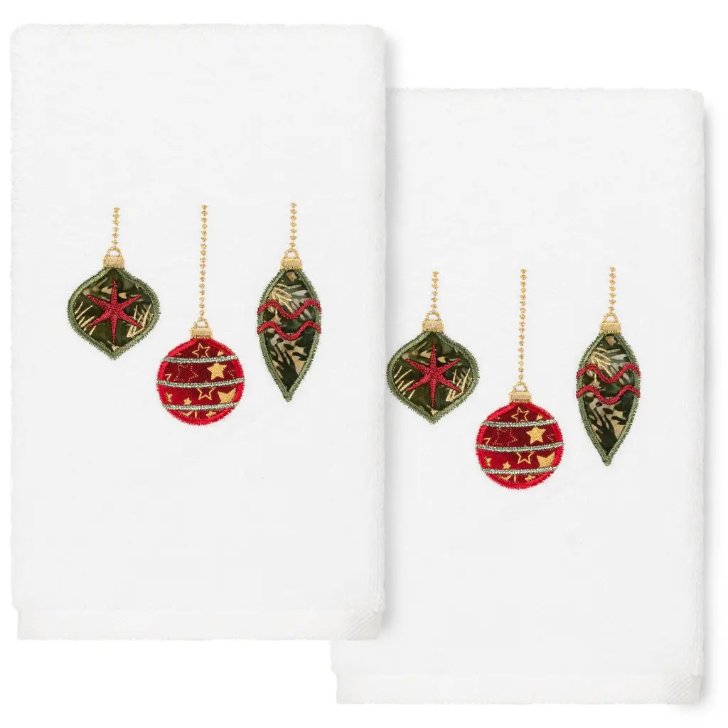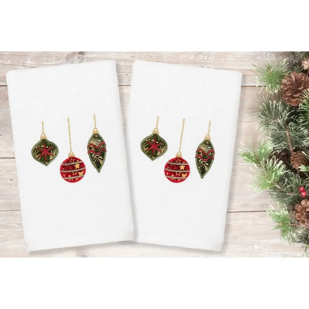 Bring a joyous Christmas spirit to your decorations with elegant embroidered hand towels for your guest bath. These "Christmas Ornaments" towels feature 3 different patterned decorations, suspended by sparkling beaded chains, which will add a merry mood to your festivities. This special & luxurious Christmas terry hand towel is manufactured with the finest Turkish cotton fiber for maximum softness and absorbency. Embroidered Christmas Ornaments Design 100% Genuine Turkish Cotton Machine wash cold, no bleach, line dry or dry clean Available in color options white or sand Set includes 2 embroidered hand towels (16" x 30") Embellished in USA Made in Turkey