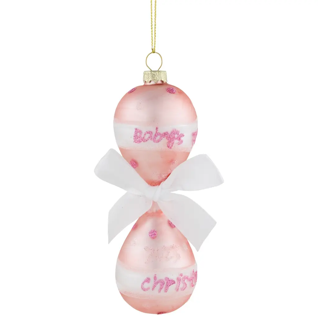 Celebrate the joyous arrival of your little bundle of joy with this baby girl's first Christmas glass ornament. This adorable ornament features a charming design with the words "Baby's First" beautifully inscribed on the top of the rattle and "Christmas" on the bottom. Adorned with a delicate white bow and a sprinkle of pink and white glitter, this ornament adds a touch of whimsy and sparkle to your Christmas tree. It's the perfect keepsake to commemorate your baby girl's first holiday season, creating treasured memories that will last a lifetime. Product Features: Glass baby girl's first Christmas ornament Top of the rattle reads "Baby's First", Bottom of the rattle reads "Christmas" Pink rattle is accented with a white bow and pink and white glitter Fully dimensional ornament Comes with a ornament cap and cord For indoor use only Dimensions: 5" high x 1.75" diameter Material(s): glass