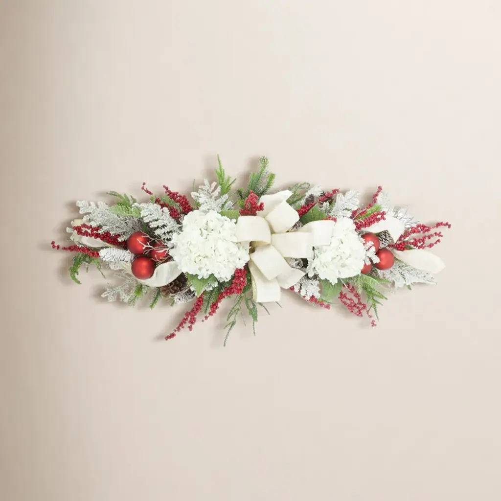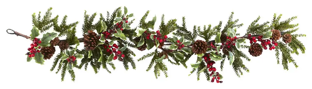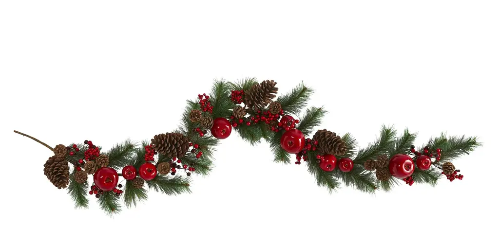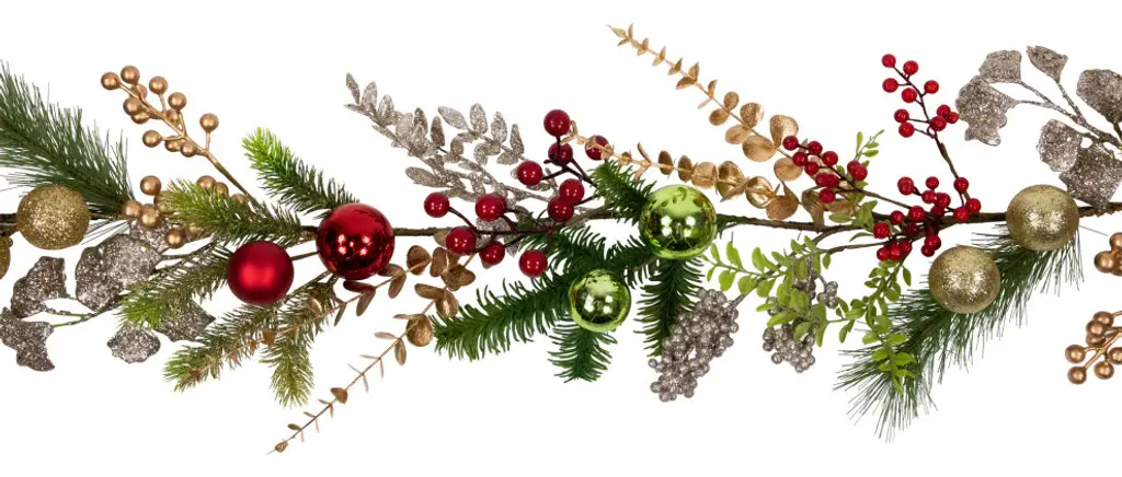 This exquisite garland is the epitome of holiday elegance. Unlit for versatile placement it features a delightful combination of mixed greenery glistening gold berries and leaves and an array of captivating ball ornaments in matte and shiny finishes. Unlit for versatile styling it brings the enchanting beauty of the season indoors creating a cozy and festive ambiance for your holiday gatherings. Perfect for adorning mantels staircases or tabletops this garland will infuse your space with the enchanting spirit of the season. Product Features: Unlit For indoor use only Bendable wire center allows you to shape the garland any way you desire Brown metal hook on one end for easy hanging Adorned with mixed greenery gold berries and leaves glitter matte and shiny ball ornaments Dimensions: 5'' long x 10" wide Material(s): plastic/metal Note: Branches are compressed for shipment and need to be fluffed out upon arrival to look like the photo.