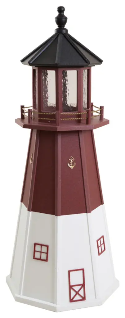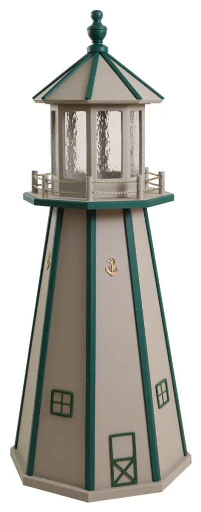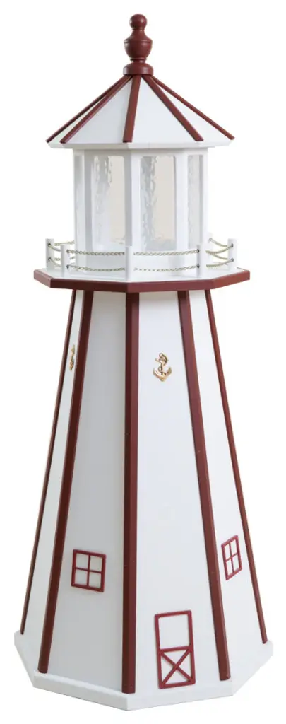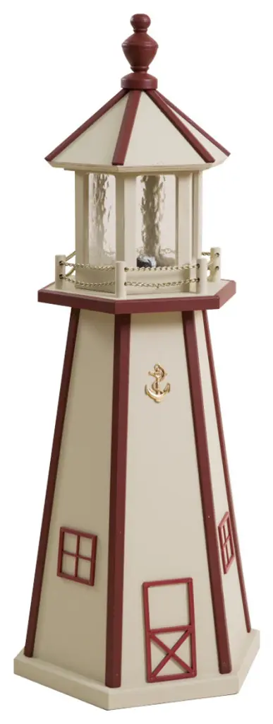 Create a gorgeous center piece in any garden or on any porch with this gorgeous Amish made lighthouse!Amish Made in the USA High quality materials and hand painted with exterior paintIf Standard electric light is chosen, the cord is 8 feet long If Solar Light is chosen, the 3.2 rechargeable solar battery is provided. Digital colors may vary slightly from actual product colors