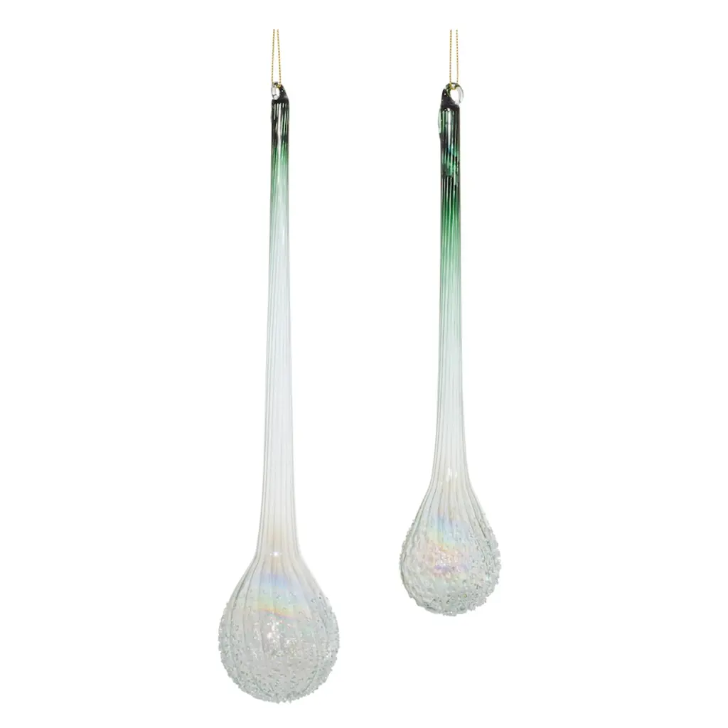 Adorn your Christmas tree and holiday decor with this stunning set of Beaded Glass Drop Ornaments. Featuring 12 pieces, the wintry white and blue tones paired with the beaded design is the perfect combination to create a memorable display. The quality glass composition and delicate silver string hanging accent is sure to endure for seasons to come. Whether you're adding a touch of cheer to your home or gifting to a loved one, these ornaments will definitely bring smiles.
