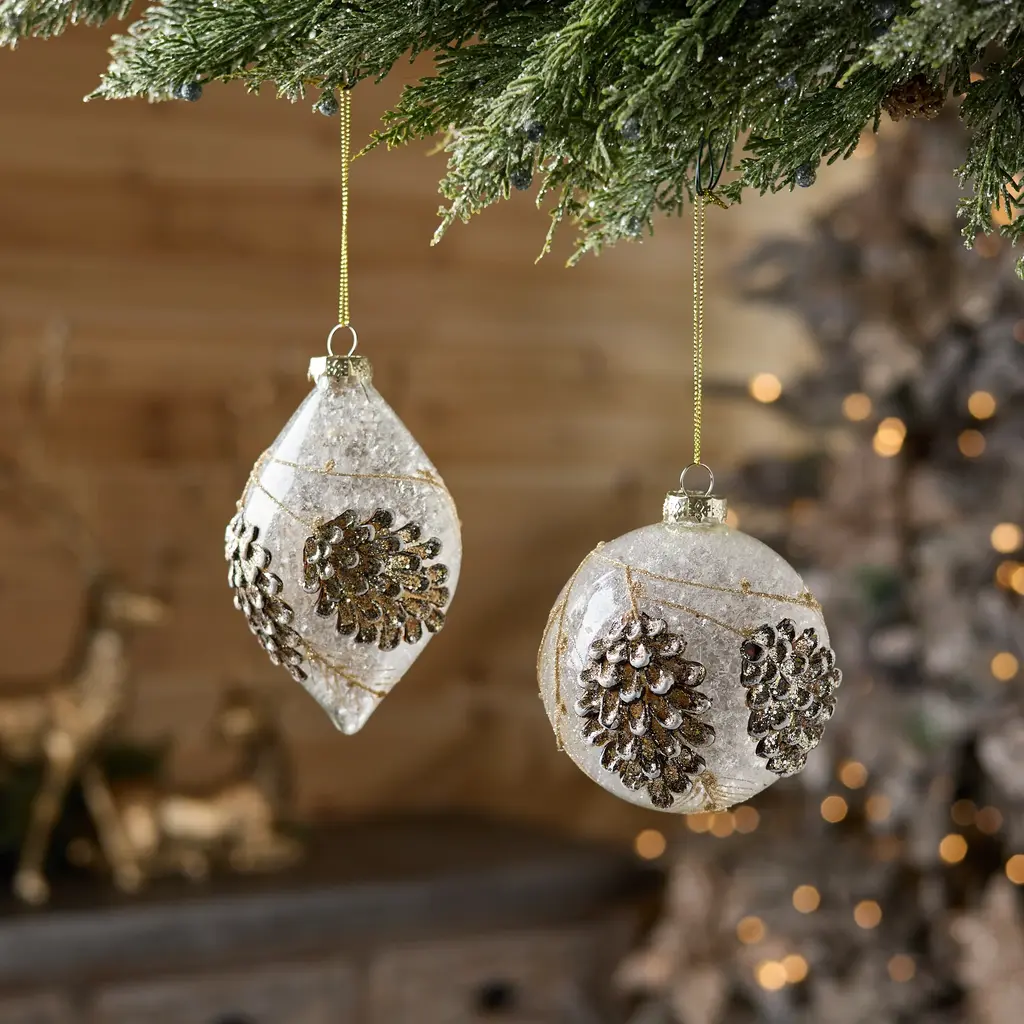 Adorn your Christmas tree and holiday decor with this stunning set of Beaded Glass Pinecone Ornaments. Featuring 6 pieces, the wintry white and chic silver tones paired with the beaded design is the perfect combination to create a memorable display. The quality glass composition and delicate silver string hanging accent is sure to endure for seasons to come. Whether you're adding a touch of cheer to your home or gifting to a loved one, these ornaments will definitely bring smiles. - Measures 4.25 x 4.25 x 4.75; 3.5 x 3.5 x 5.75" - Material: Glass - Recommended for indoor use only