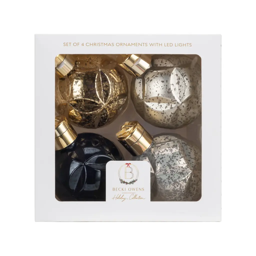 Celebrate the holiday season with Becki Owens LED Christmas Ornaments. This set of 4 includes individual ON/OFF switches, ready for easy hanging on Christmas trees everywhere. Upgrade last year’s decorations with stunning new ornaments fit for Santa himself! Spread the joy of festive holiday cheer this year, and every Christmas to come.PRODUCT FEATURES:Set of 4 Lighted OrnamentsLED Plastic MercuryIndividual ON/OFF SwitchesReady to HangDimensions: 7.5” x 7.5” x 3.5”LIGHT UP LED ORNMANETS‘Tis the season to be jolly! The ornaments have a festive LED glow that sparkles out from the center of the bauble, creating cheery brightness and warmth. Deck the halls of houses, apartments, schools, office buildings and retail stores with these Fa-La-La-La-Lovely ornaments!FESTIVE CHRISTMAS TREE DECORSo much fun to decorate with! Use these ornaments to add a delightful pop to your tree, fireplace, mantel, or window area. No matter how you deploy them in your decor, you’ll enjoy days and weeks of merriment with these beauties glinting perfectly in the background.BECKI OWENS LIVINGSince her vault onto the Instagram design stage in 2015, Becki has designed hundreds of spaces working with everything from intimate remodels to complete custom builds, and her projects have been featured in mainstream publications such as Luxe Magazine, Wall Street Journal, and Architectural Digest. Now we’ve created a space where everyone can get the unique Becki Owens signature style for their own space—Becki Owens Living. Come see, be inspired by, and shop the Becki Owens look for your home. Because, at Becki Owens Living, we embrace real, everyday life to help you create a space that is completely livable, completely stylish, and completely yours.