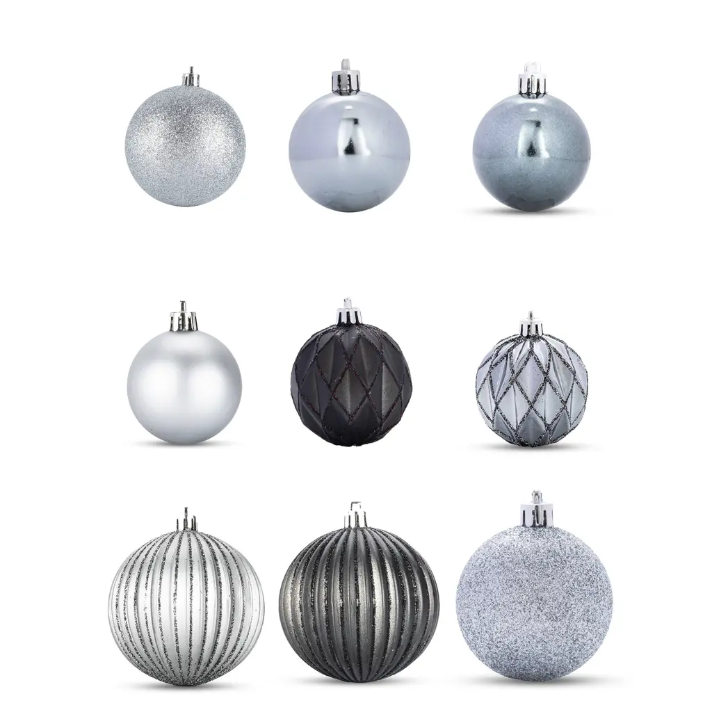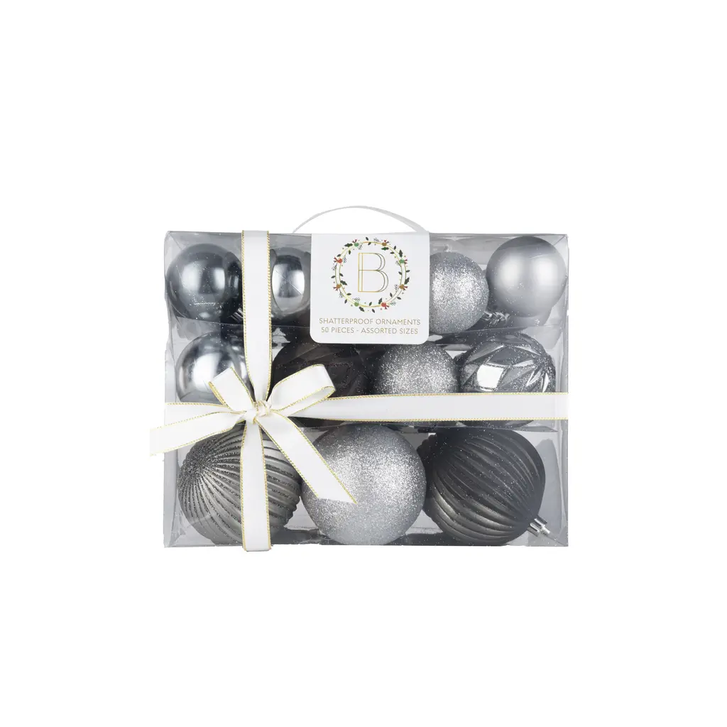 Becki Owens Set Of 50 Metallic Shatterproof Christmas Ornaments - 3 Sizes - Small, Medium & Large - Silver