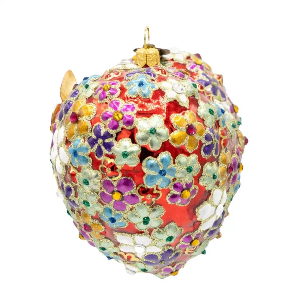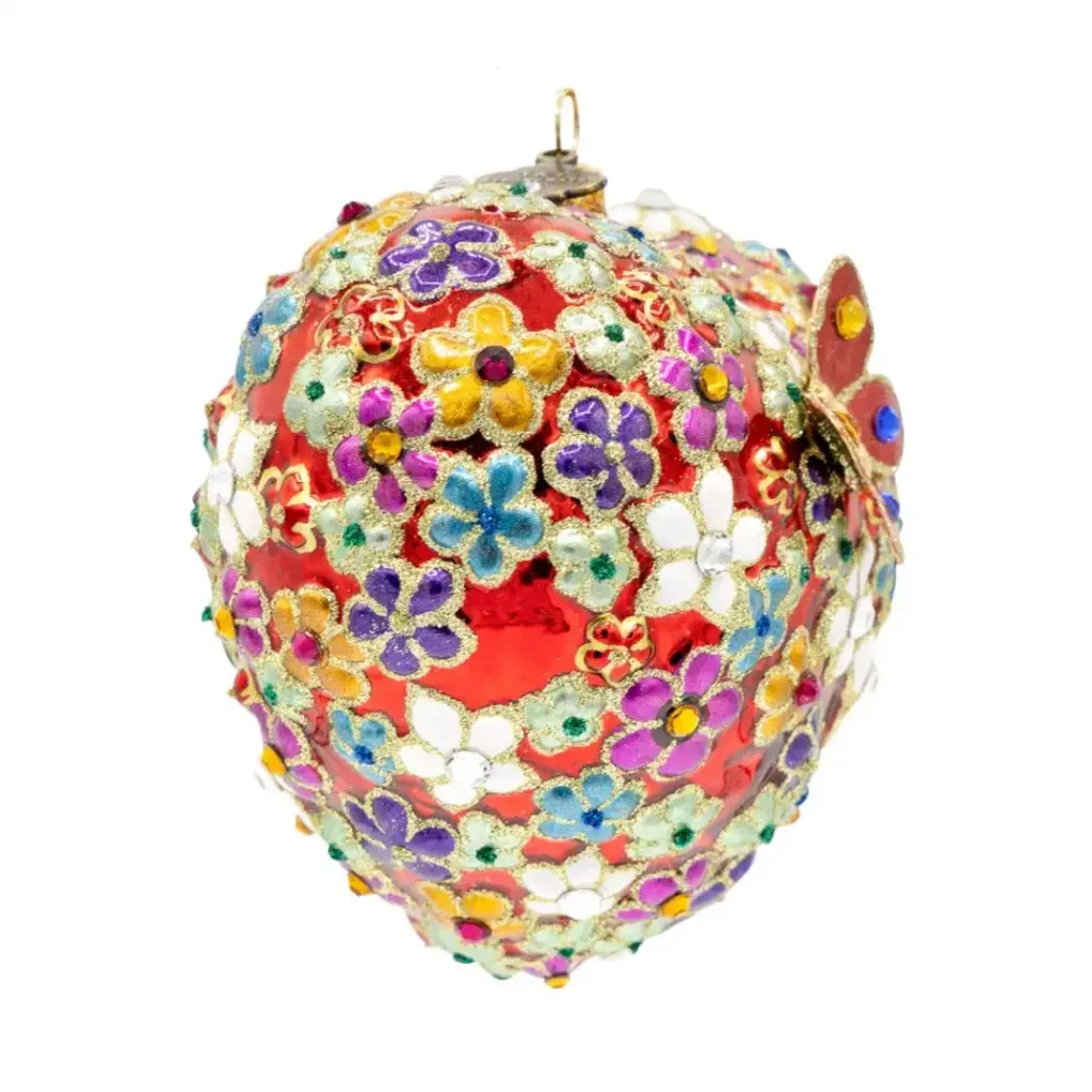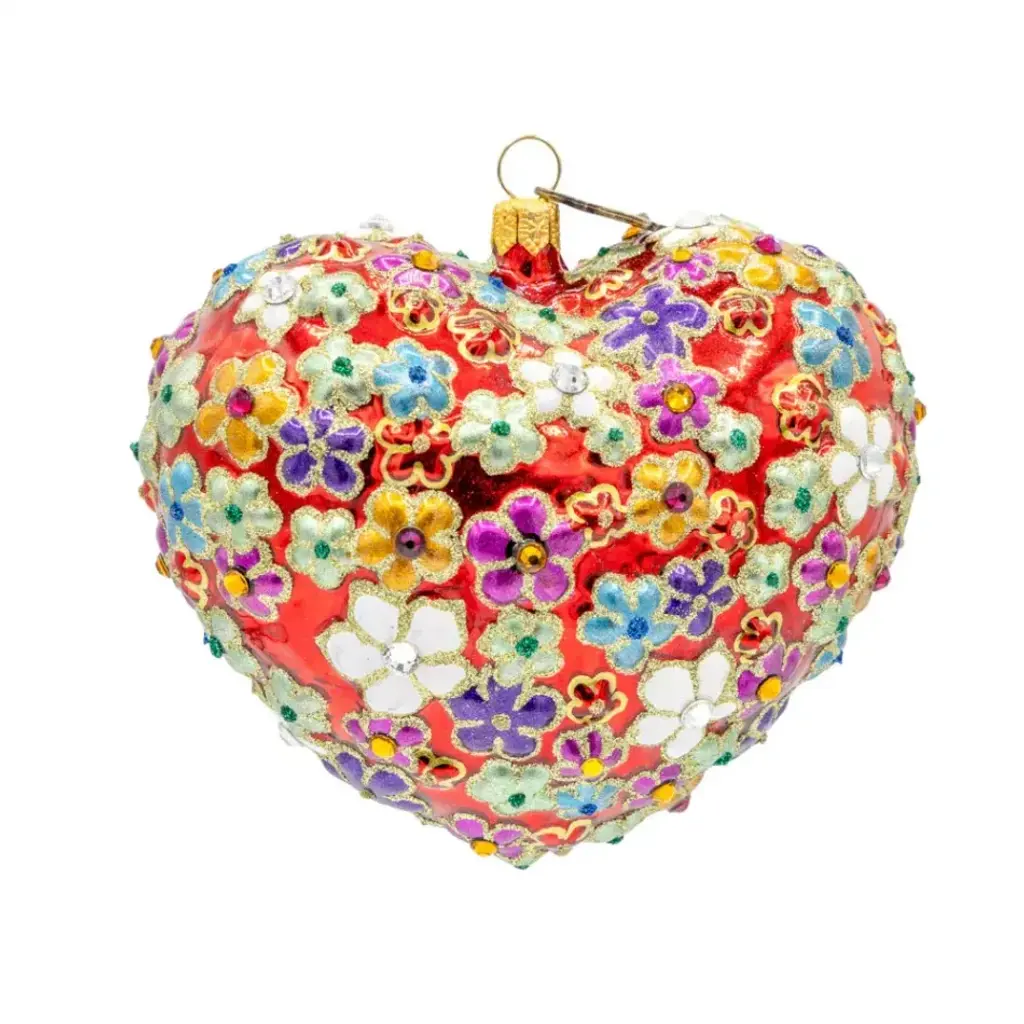 The Blossom Heart ornament is a radiant symbol of love and artistry. This rich red heart is adorned with intricate floral detailing and finished with a single red butterfly accented in gold.