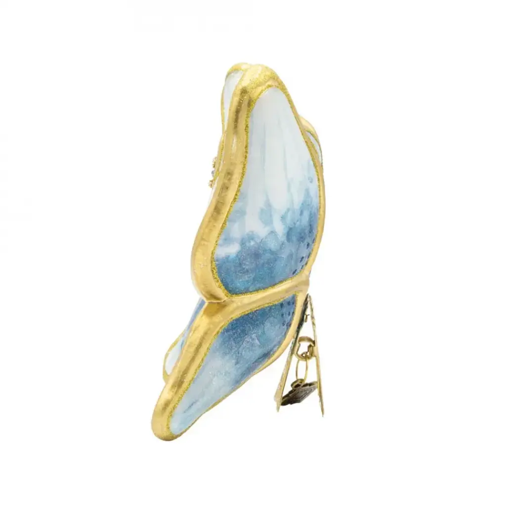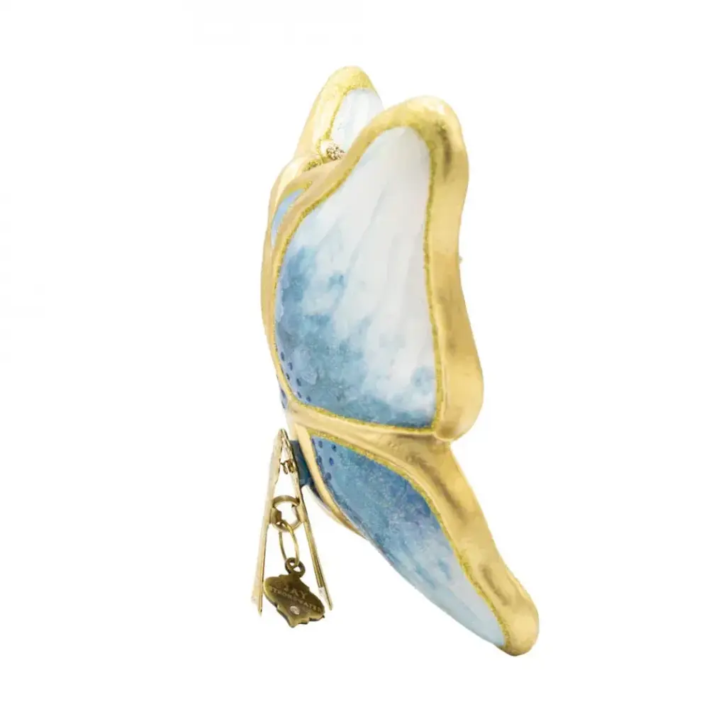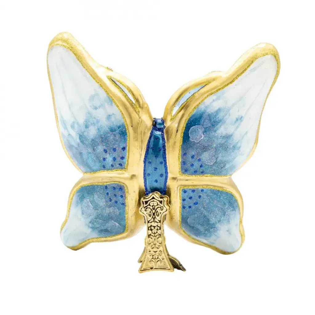 Handcrafted in Poland from mouth-blown glass, this exquisite butterfly glows in painterly layers of sapphire and sky blue enamel, finished with golden glitter accents. A radiant symbol of transformation and artistry.