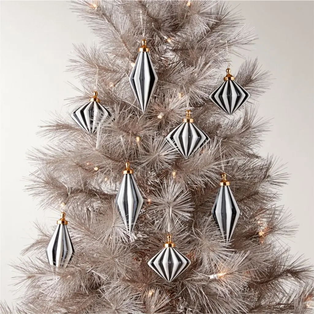 A nod to vintage European design, hand-painted glass ornaments feature striking black and white stripes on unique silhouettes. Topped with a gold cap and sheer black ribbon for hanging. Set of eight includes four tall and four wide ornaments. CB2 exclusive.