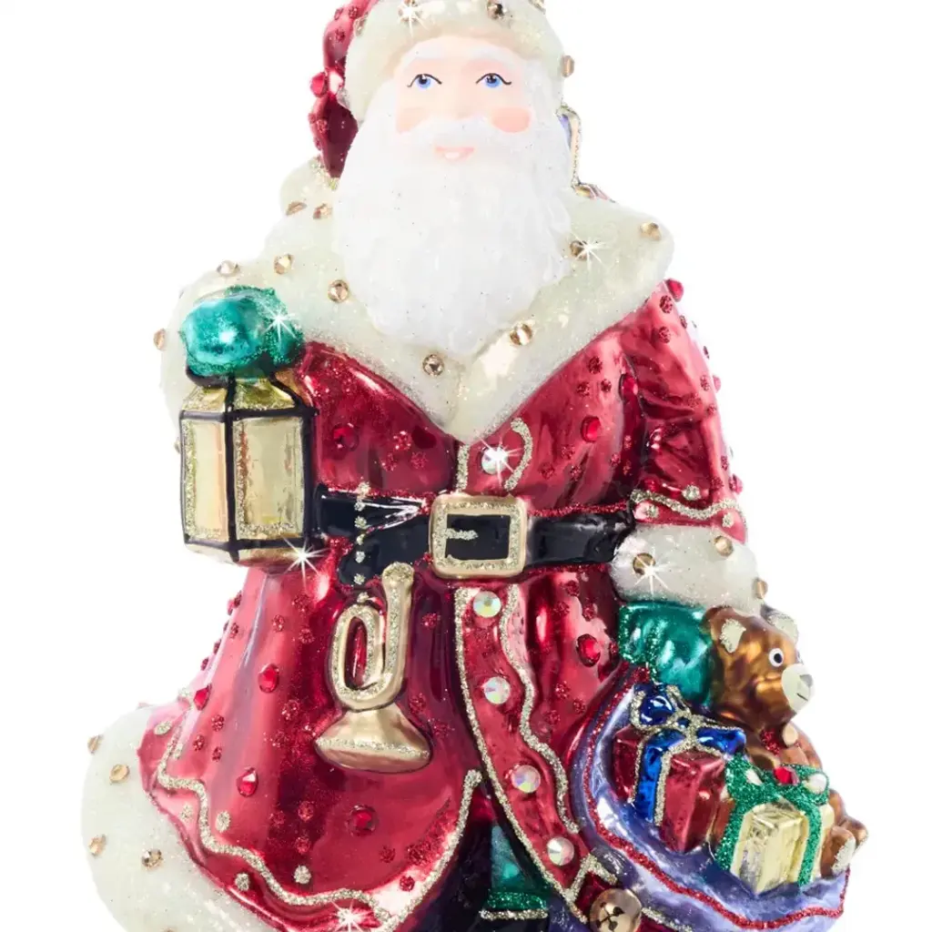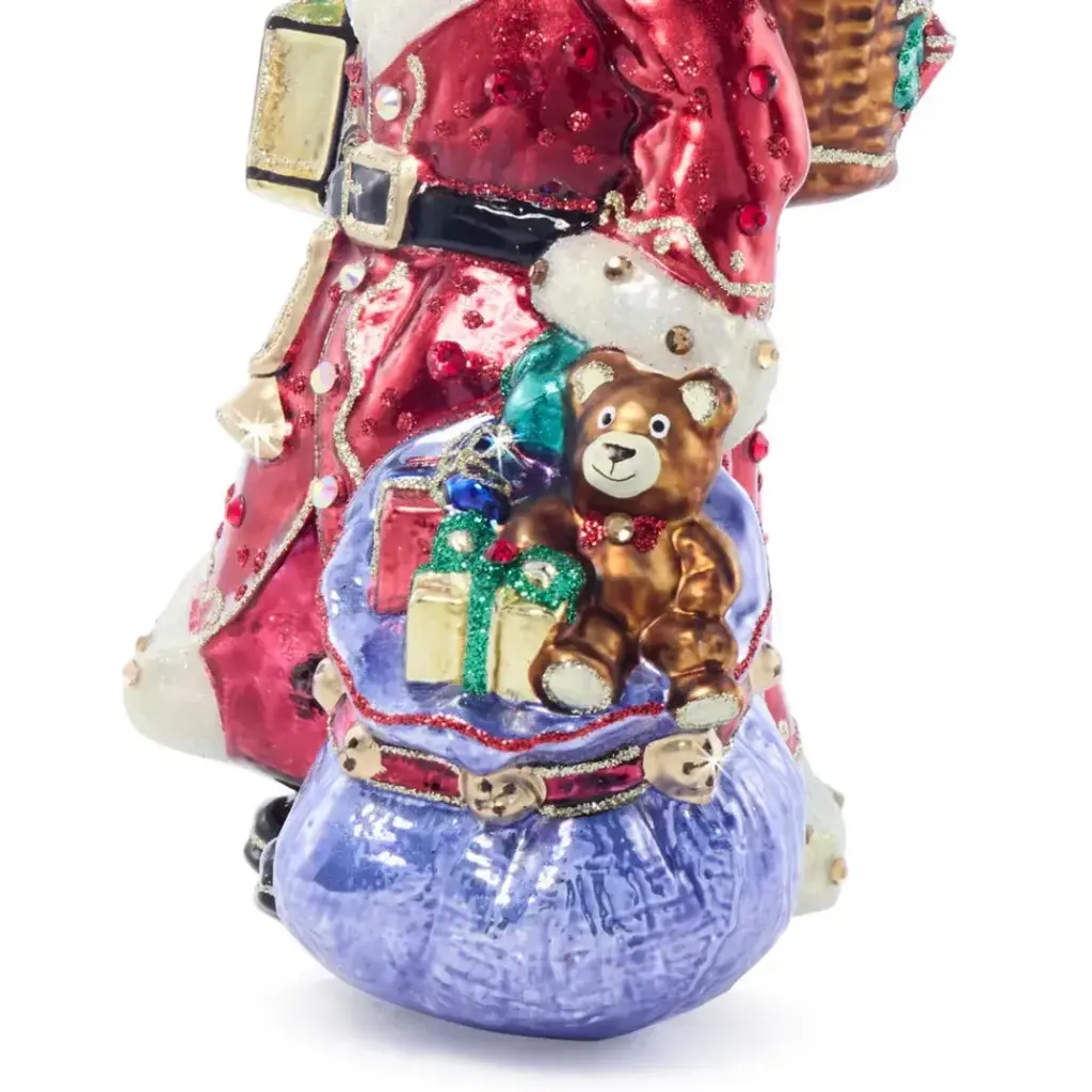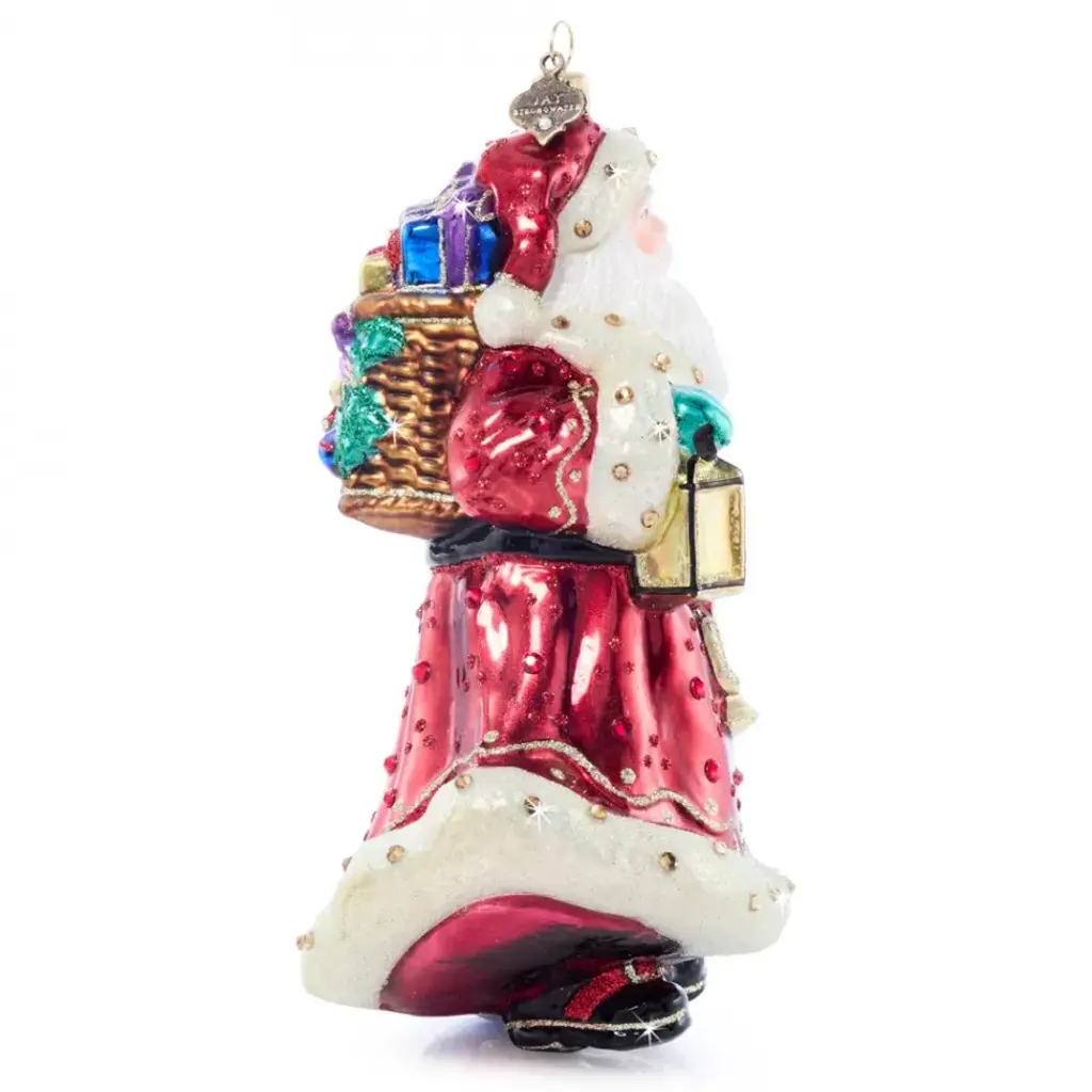 The Bountiful Santa Glass Ornament is a timeless depiction of the classic Santa Claus. This handcrafted ornament features Santa robed in red, holding a lantern and an elegant sack. Hand-enameled and adorned with gold-hued European crystal embellishments, it exudes a sense of warmth and festive spirit. A true vision of Christmas, this Polish-crafted ornament is sure to bring a truly exceptional festive touch to your tree.