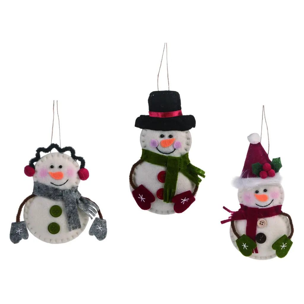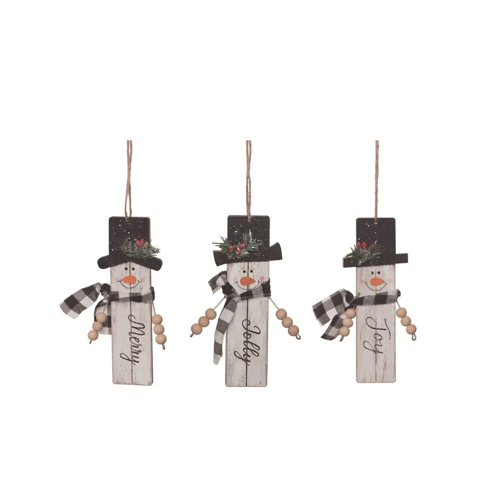 Description : Each snowman has a smiling painted face and is adorned with a faux holly bough with red berries. One snowman wears a red and black buffalo check hat with a burlap scarf, another wears a matching red and black buffalo check hat and scarf, and the third wears a black top hat with a red and black buffalo check scarf. The top of each ornament includes a jute rope loop to use for a hanging display, perfect for placing on a tree during Christmas and Winter. Specification :