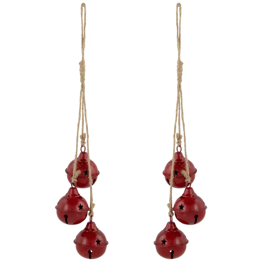 Enhance your holiday decor with this delightful set of Christmas jingle bell ornaments. Featuring a shiny finish, these bells come in a festive red hue. Suspended on a jute rope, they add a rustic yet vibrant touch to any space. Perfect for hanging on Christmas trees, these jingle bells will bring joyous cheer to your home this season. Features: Christmas jingle bell ornaments Set of 2 in a shiny red finish Each has 3 jingle bells Designed with star cutouts Ready to hang on a jute rope Display together or separately on doors and Christmas trees Indoor use recommended Dimensions: 13.5"H x 3"W x 2"D Material(s): metal/jute