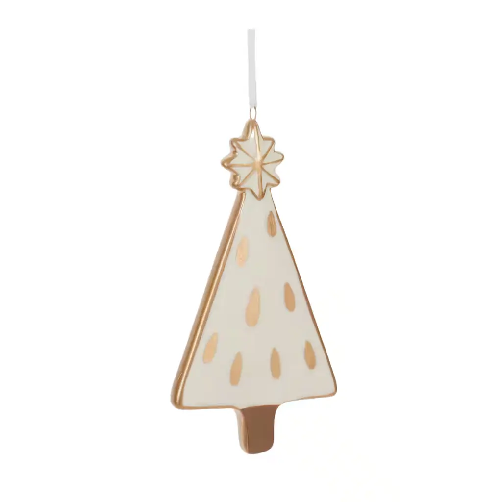 Add a modern touch to your Christmas tree with this stunning set of Ceramic Pine Tree Ornaments. Featuring six pieces and three assorted designs, the pink and gold tones paired with the modern pine tree design with star and snowflake accents are the perfect combination to create a memorable display. The quality ceramic composition with delicate white ribbon hanger is sure to endure for seasons to come. Whether you're adding a touch of cheer to your home or gifting to a newlywed couple, these ornaments will definitely bring holiday spirit to your home.