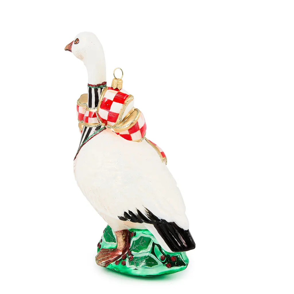 Add MacKenzie-Childs signature charm to your Christmas season with the Check It Out Goose Glass Ornament. This mouth-blown ornament features a festive foul adorned with a red check ribbon. The stunning collectible comes with an authentic brass logo charm, making it a wonderful gift or addition to your own Christmas tree.