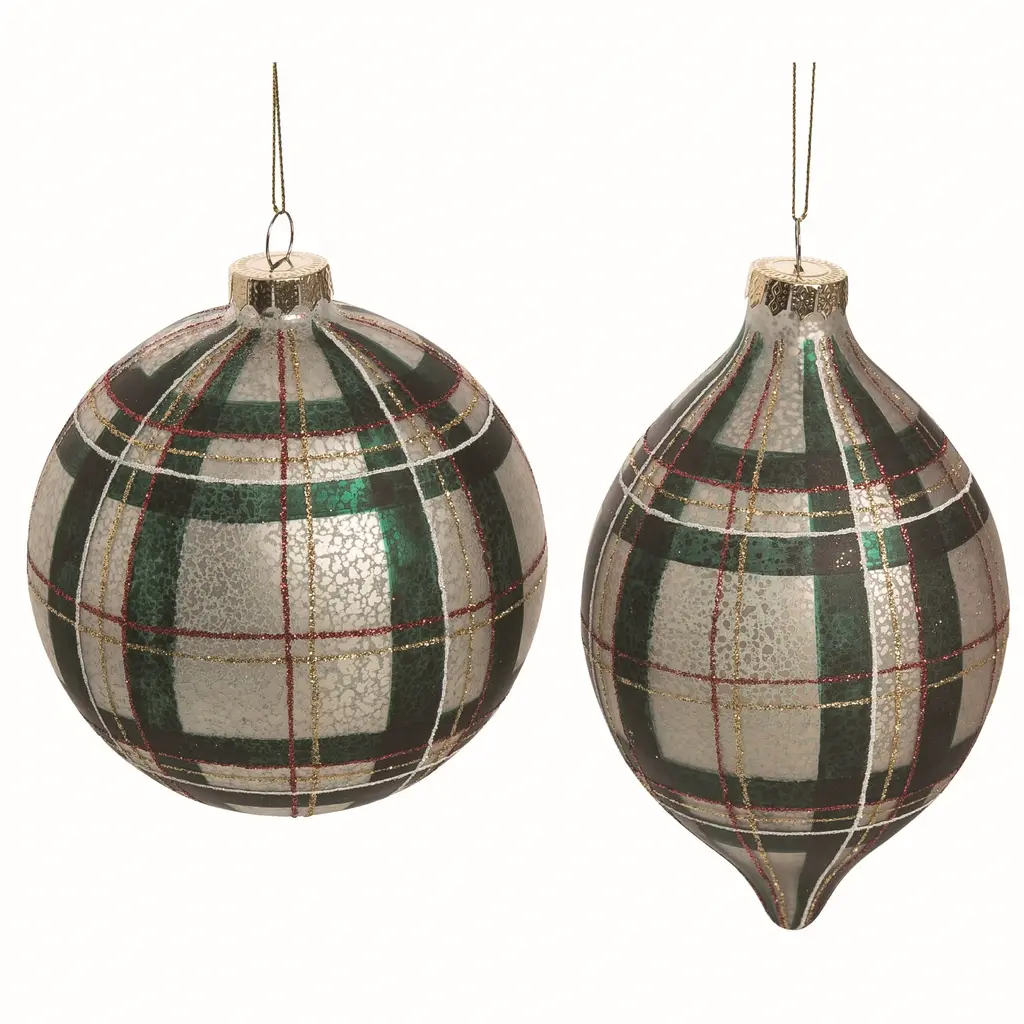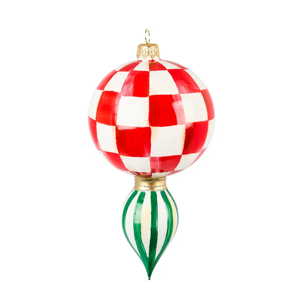 Add MacKenzie-Childs signature charm to your Christmas season with the Check It Out Green Check Lightbulb Fabric Ornament. This decorative bauble is wrapped in soft green and green check fabric swirls, accented with a gold topper. A wonderful gift and classic addition to any Christmas tree.