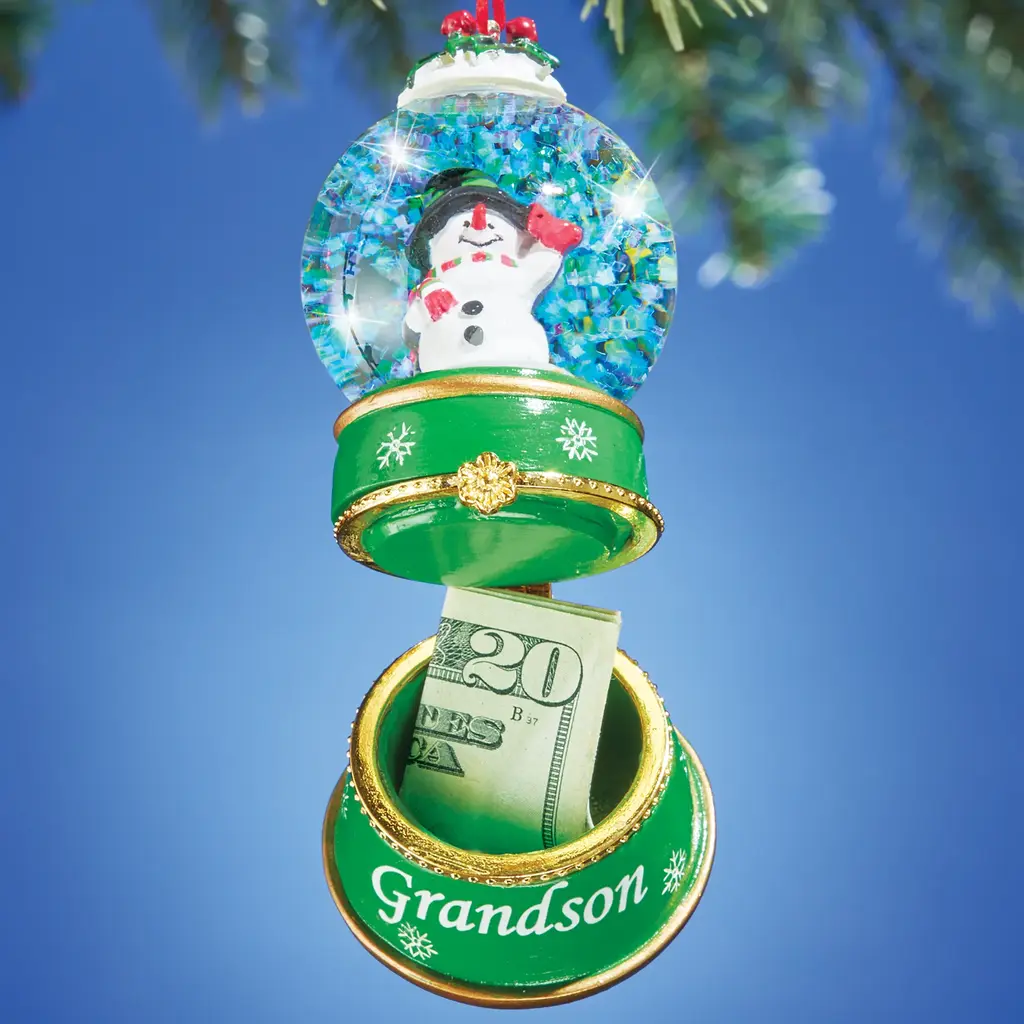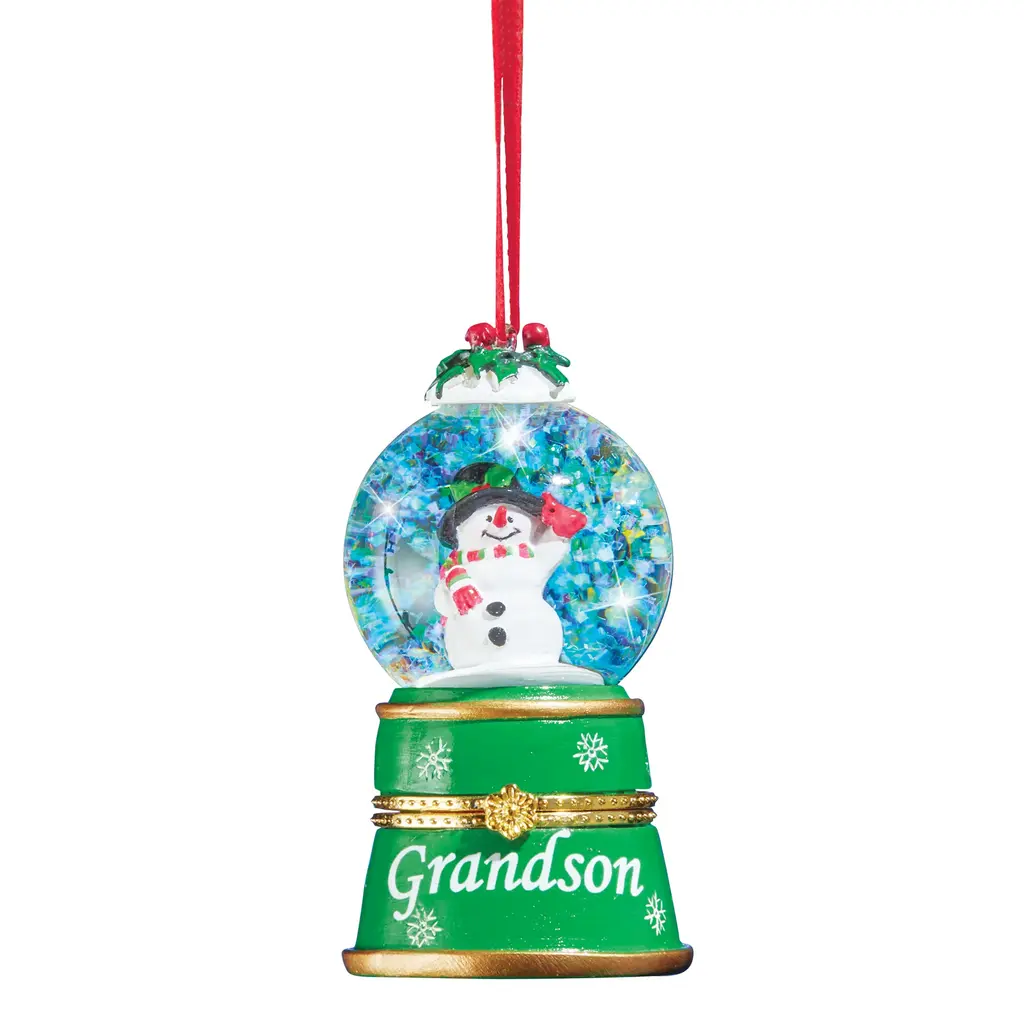 These charming snow globe ornaments decorate your tree and open up so you can put a gift inside! Available for a variety of family members, each snow globe has a fun holiday friend inside including Santa, a snowman, gingerbread girl and a cardinal. Each features bright colors and charming details with a ribbon at the top for easy hanging. Resin, glass and metal. Each is 2" Dia. x 3 1/2"H. Choose: Grandson, Son, Granddaughter or Daughter.