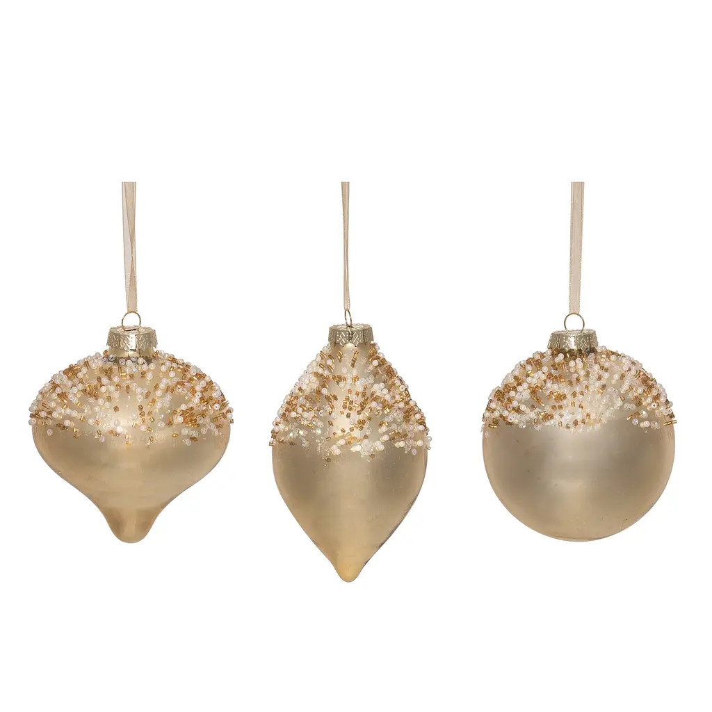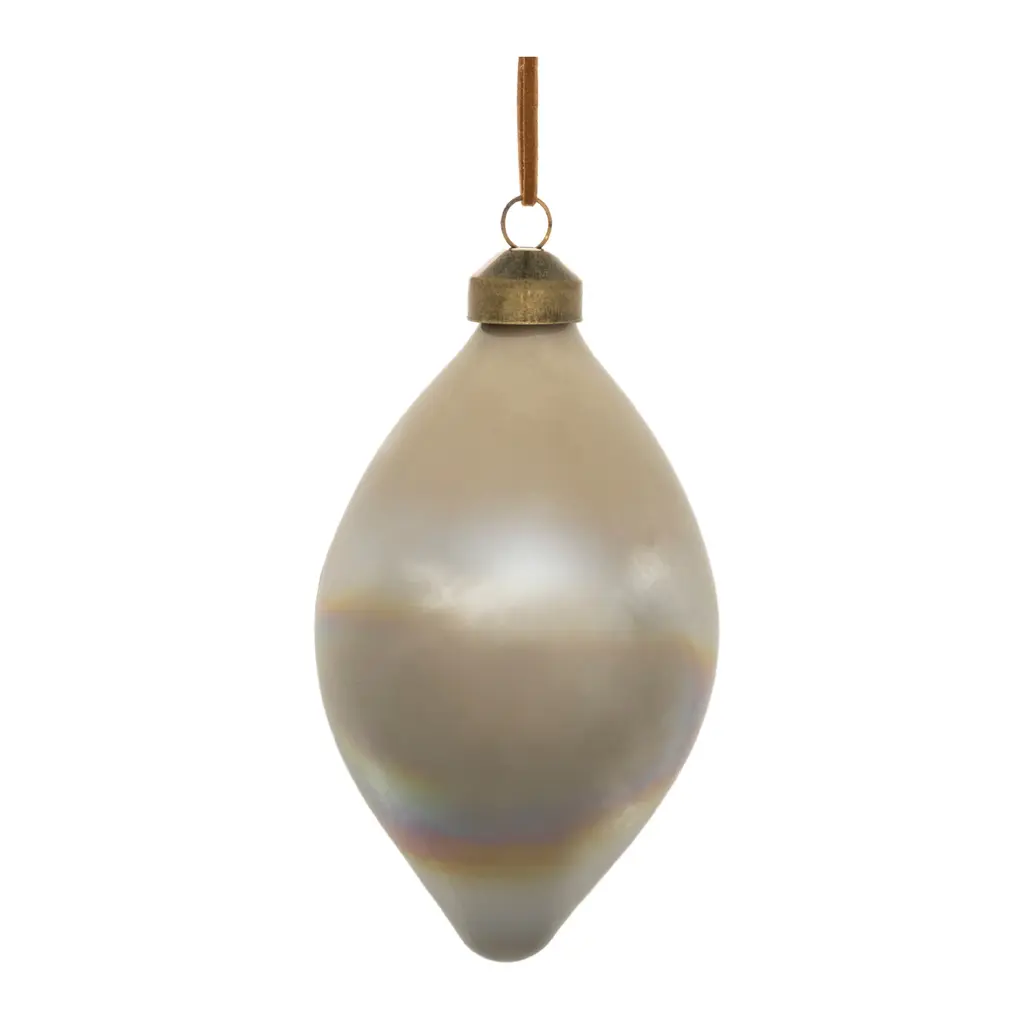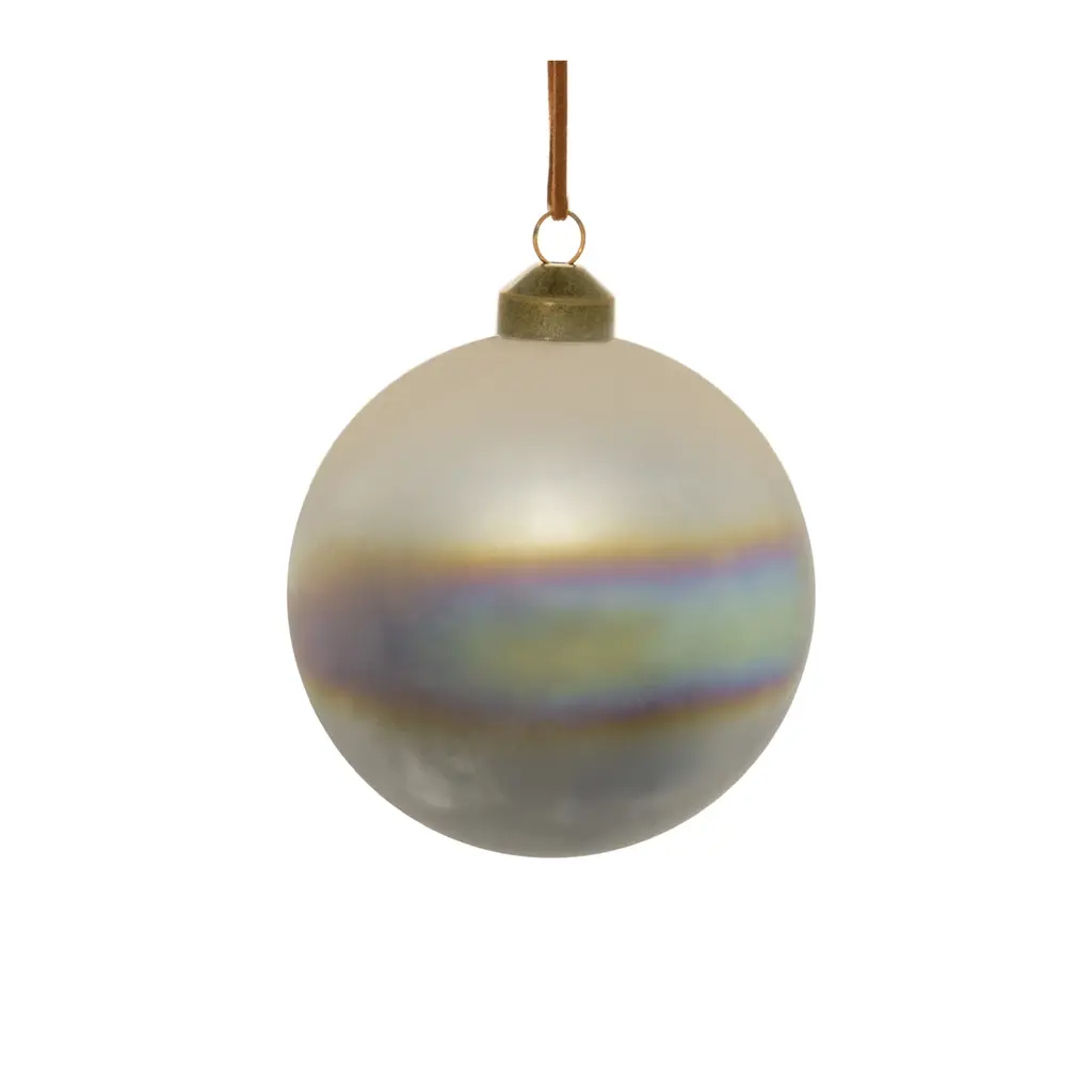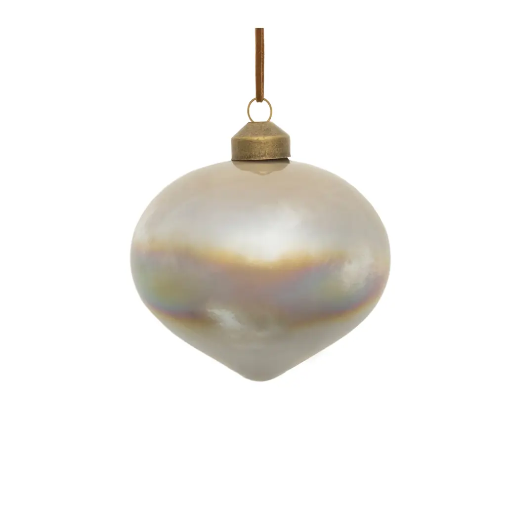 Create a serene and sophisticated holiday ambiance with this set of Cloudy Iridescent Glass Ornaments. Designed in wintry beige and gray tones with a chic iridescent finish, these ornaments catch the light beautifully, adding depth and elegance to your seasonal décor. The classic ball, onion, and oblong shapes bring variety and visual interest, while the bronze ornament cap and rustic leather cord hanger provide a refined, natural touch. Perfect for styling on a Christmas tree, wreath, or garland, this set of 6 ornaments blend seamlessly into modern and traditional holiday settings alike.
