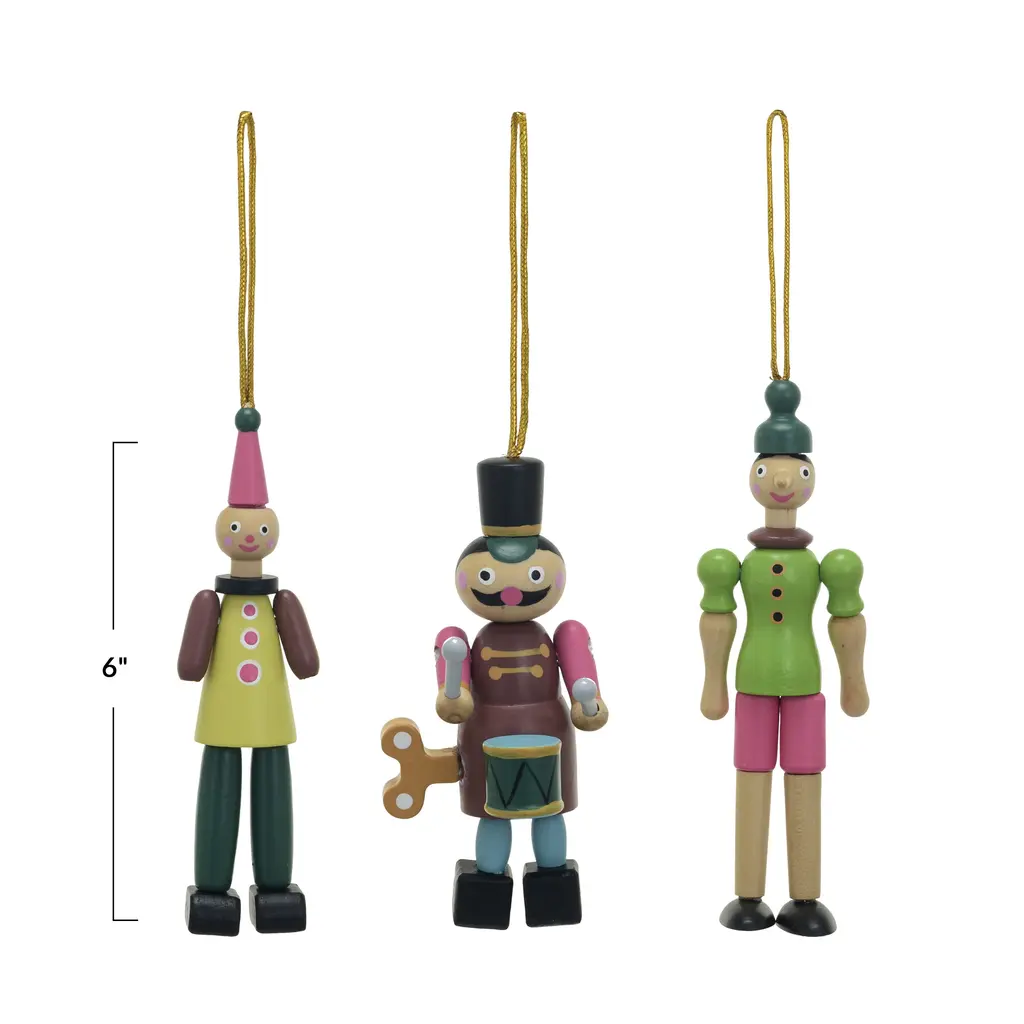 A set of 3 wood toy ornaments in multicolor that creates a fun and playful effectFeatures: