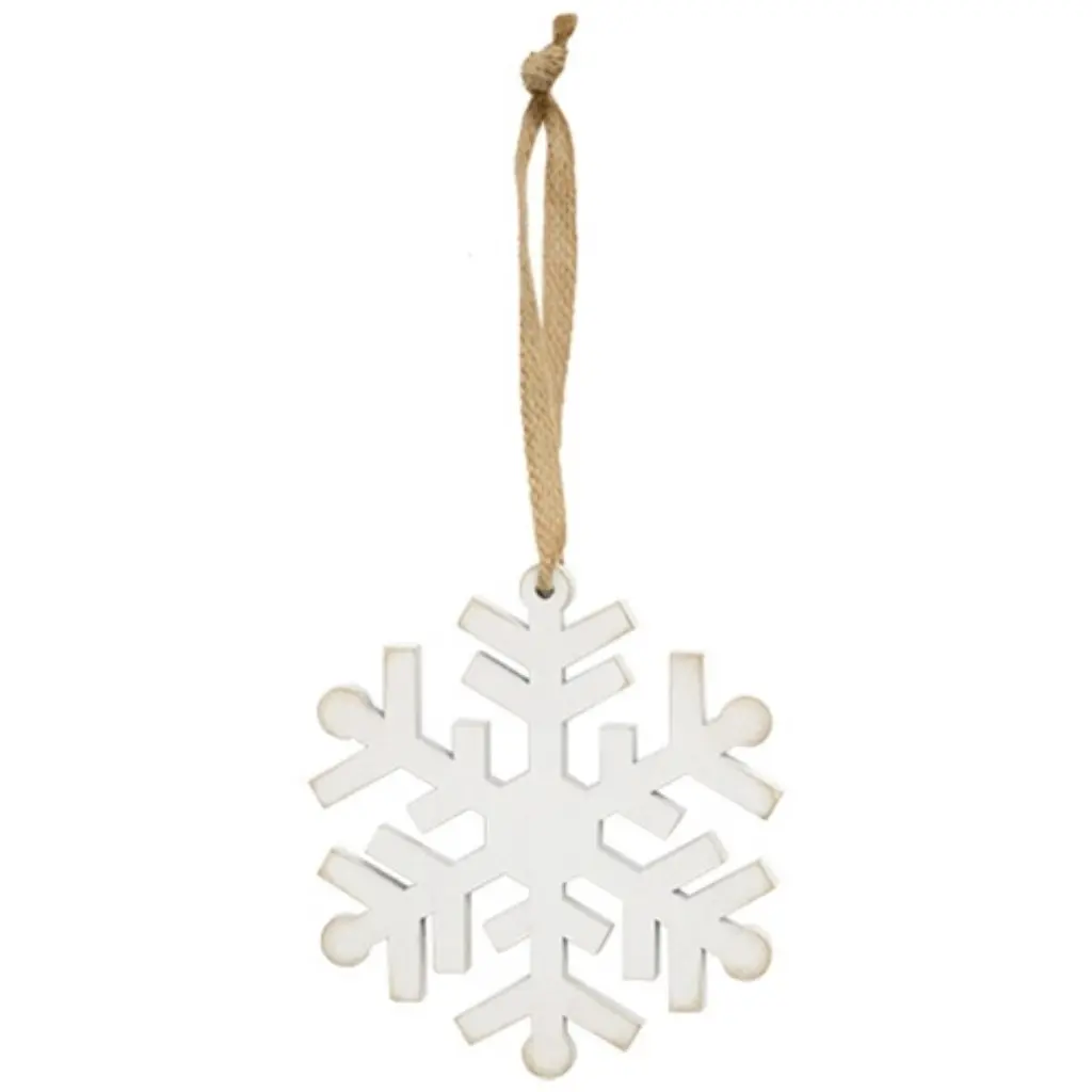 Specification:Description:The Distressed Wooden Snowflake Ornament is a versatile winter accent crafted from wood, designed to impart a rustic touch to your seasonal decorations. With its white finish and subtle weathering, this snowflake ornament exudes a charming, weathered appearance. It comes complete with a thin burlap ribbon for easy hanging, making it suitable for display on a Christmas tree, mantle, or as an embellishment for wrapped gifts. Its adaptable design ensures it adds a cozy and festive atmosphere to any holiday setting.