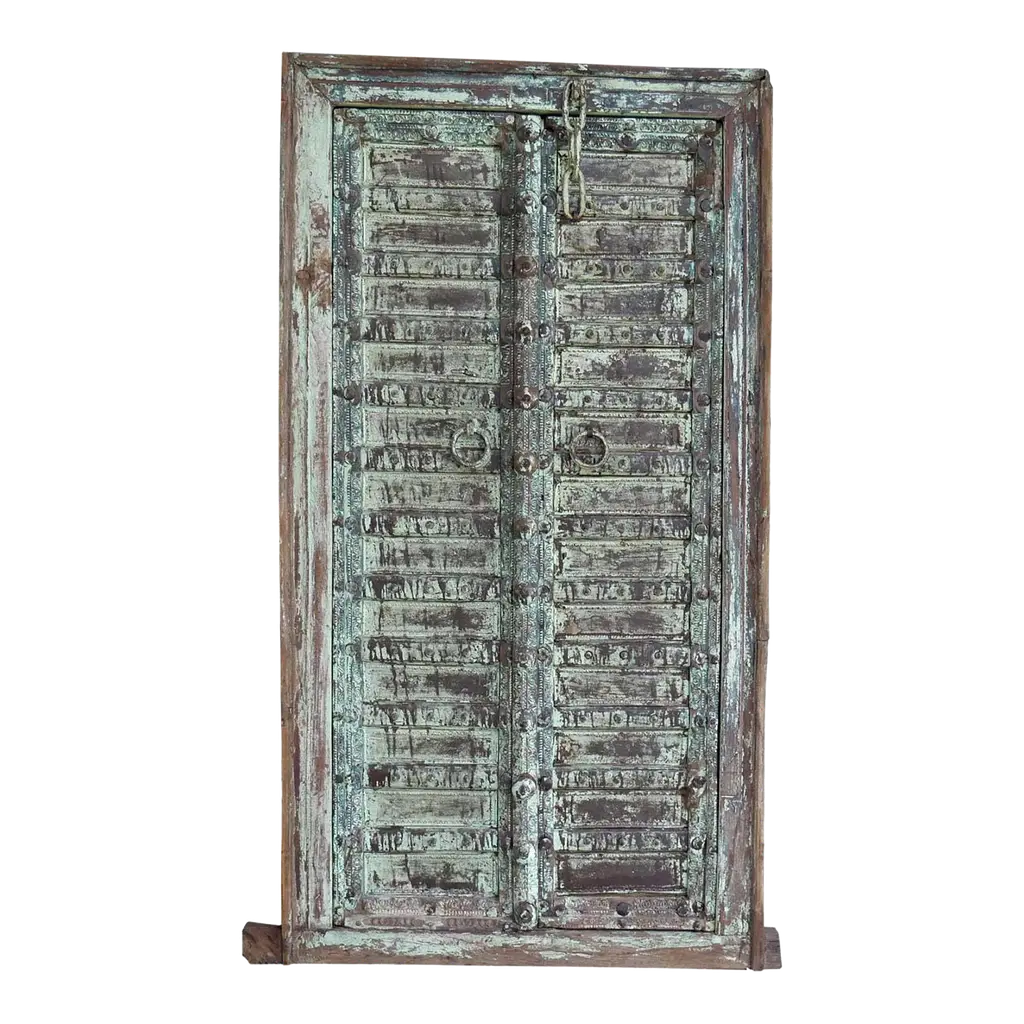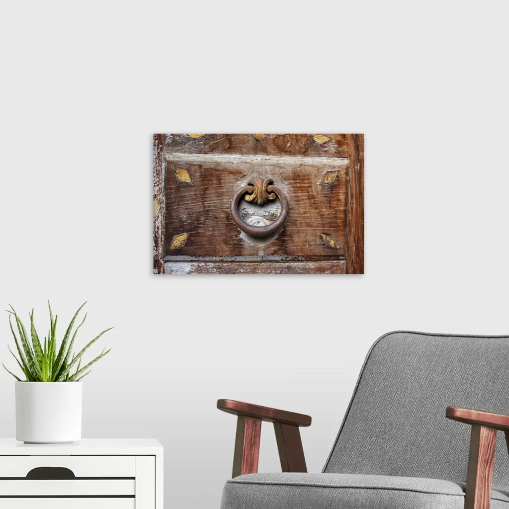 Photograph taken of an ornate door knocker. The door has faded over time and white paint has chipped off.