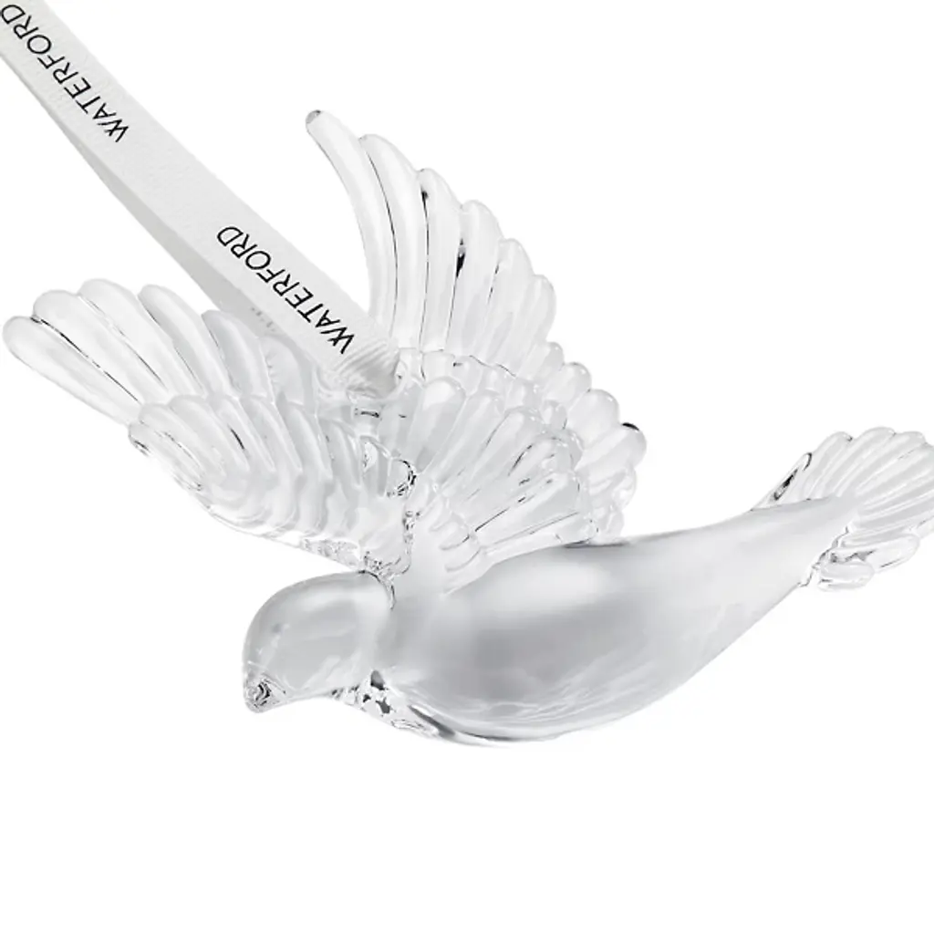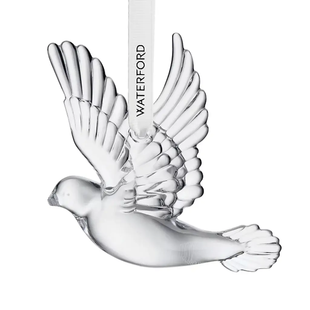 The Dove of Peace Ornament from Waterford showcases a bird-like form through sculptural crystal design. Created as a symbol of peace and hope, this ornament depicts a dove caught mid-flight with wings fully extended. Linear cuts detail the wing surfaces while the body remains smooth for visual contrast. The three-dimensional form demonstrates Waterford's ability to shape crystal beyond traditional flat cutting techniques, and its lead-free crystal construction ensures lasting clarity and strength.