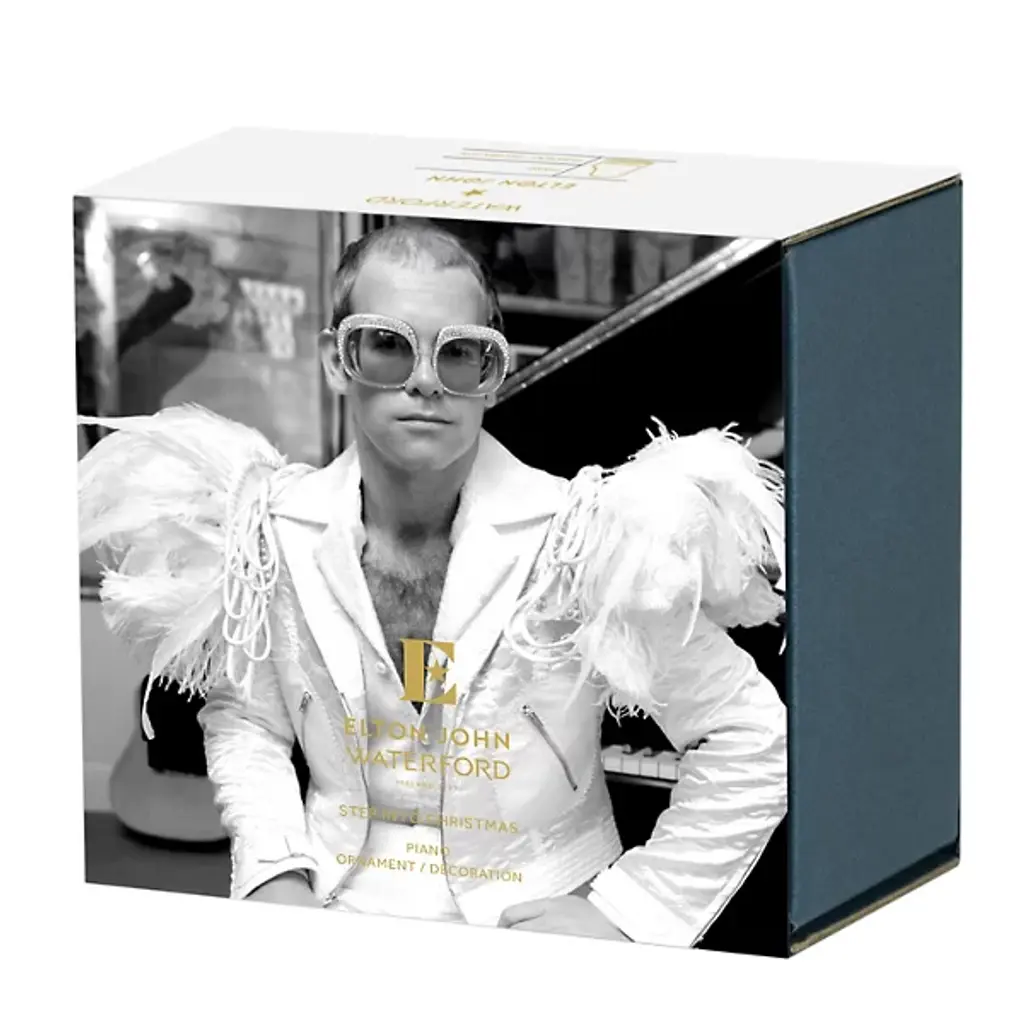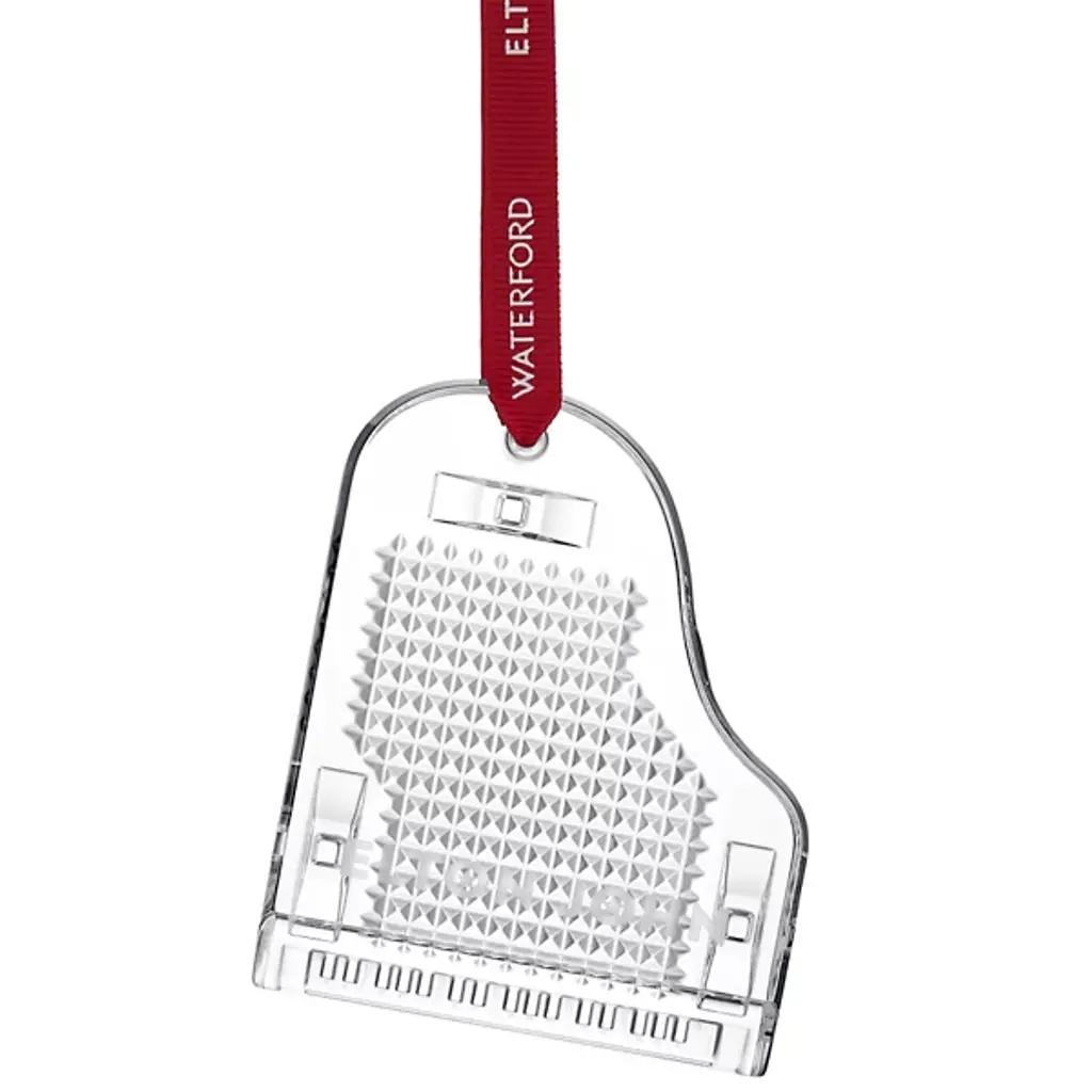 The Elton John Piano Ornament from Waterford miniaturizes the grand piano through detailed crystal construction and accurate proportional scaling. Part of the Step Into Christmas Collection, the ornament celebrates the instrument central to Elton John's musical career, spanning ballads and upbeat performances. The musician's name appears sandblasted onto the lid surface as a finishing element that completes the ornament's design details. Lead-free crystal construction captures the instrument's recognizable form while providing optical clarity that showcases the precision craftsmanship.