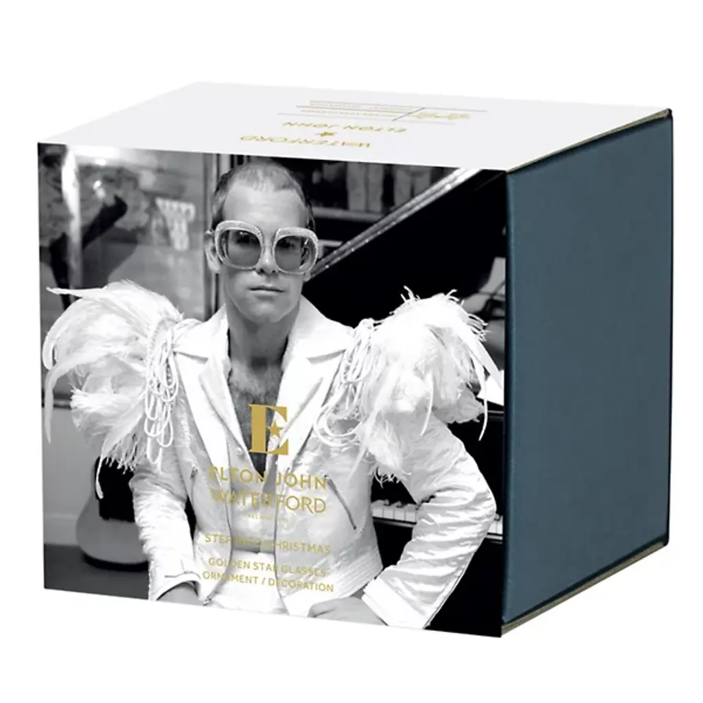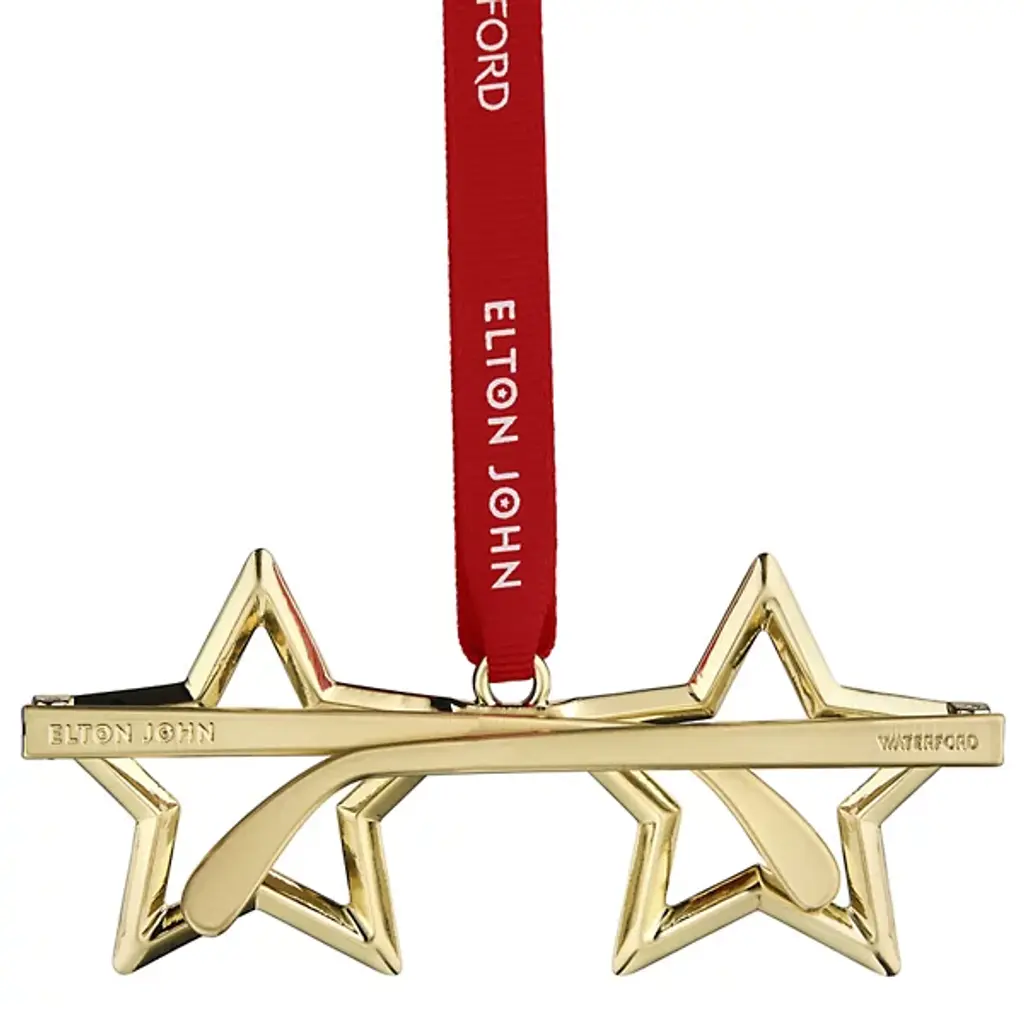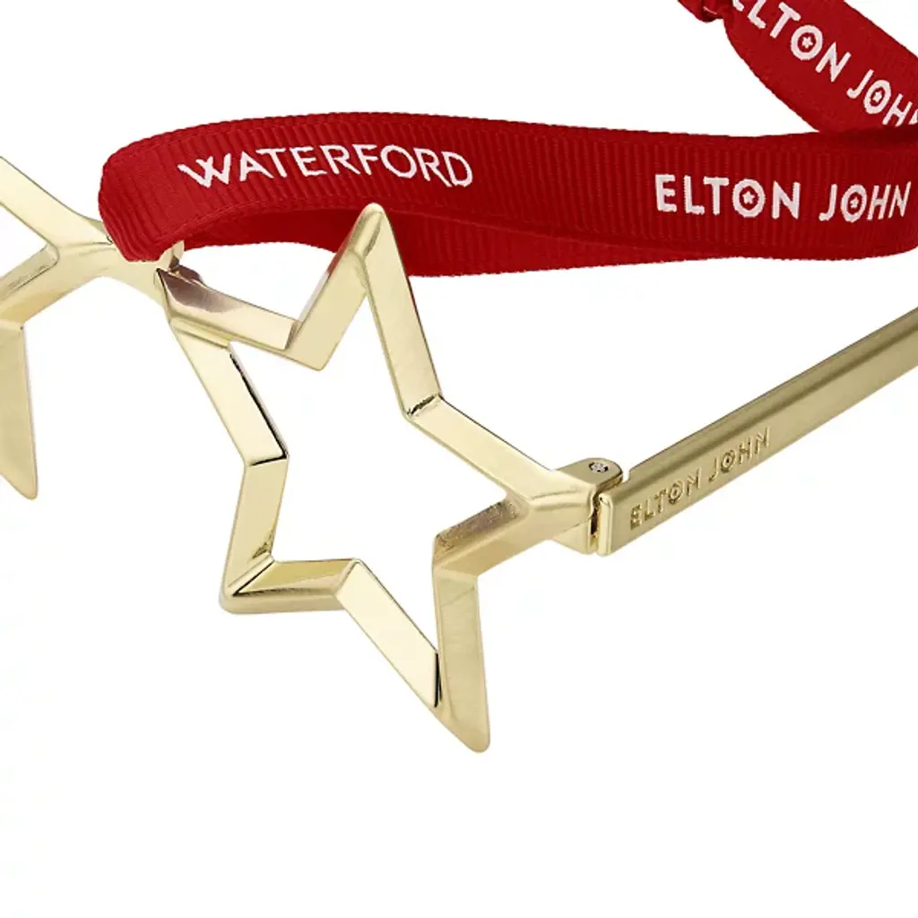The Elton John Star Glasses Ornament from Waterford captures the musician's famous eyewear through five-pointed star-shaped frames. Part of the Step Into Christmas Collection, the ornament references Elton John's vibrant eyewear collection worn throughout his career. The star configuration creates geometric symmetry while maintaining the recognizable eyeglass structure, featuring a connecting bridge and temple arms. Zinc alloy construction ensures durability, while plated finishing provides reflective qualities. The dimensional star frames create a sculptural interpretation of functional eyewear, transforming everyday accessories into decorative objects.