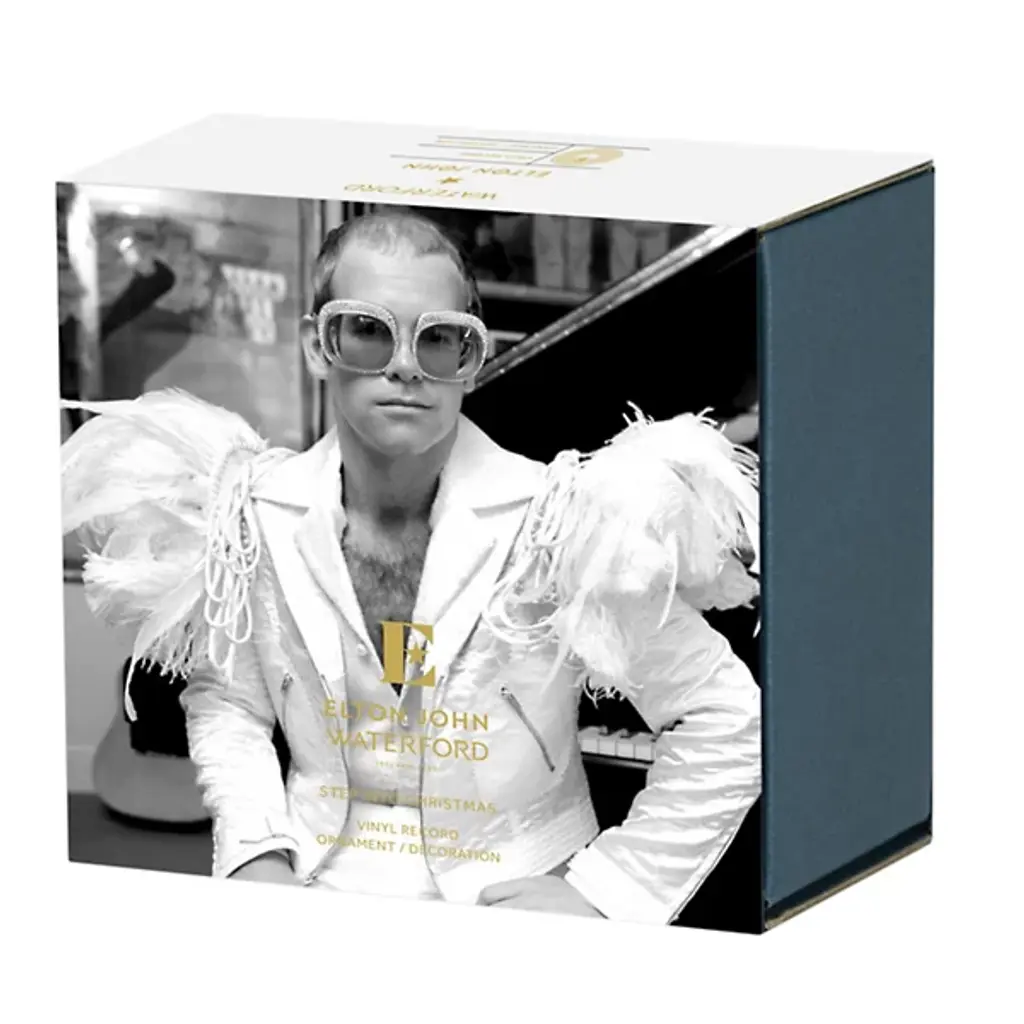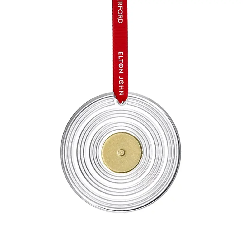 The Elton John Vinyl Ornament from Waterford reimagines the record as a circular crystal keepsake etched with concentric grooves. At its center sits a gilded medallion inscribed with Step Into Christmas, honoring the artist's enduring musical legacy. Part of Waterford's collaboration with the musician, this ornament balances nostalgic form with refined execution—each groove precisely cut into crystal that catches light like the performer himself once caught spotlights. Red grosgrain ribbon threads through for display in specially designed packaging.