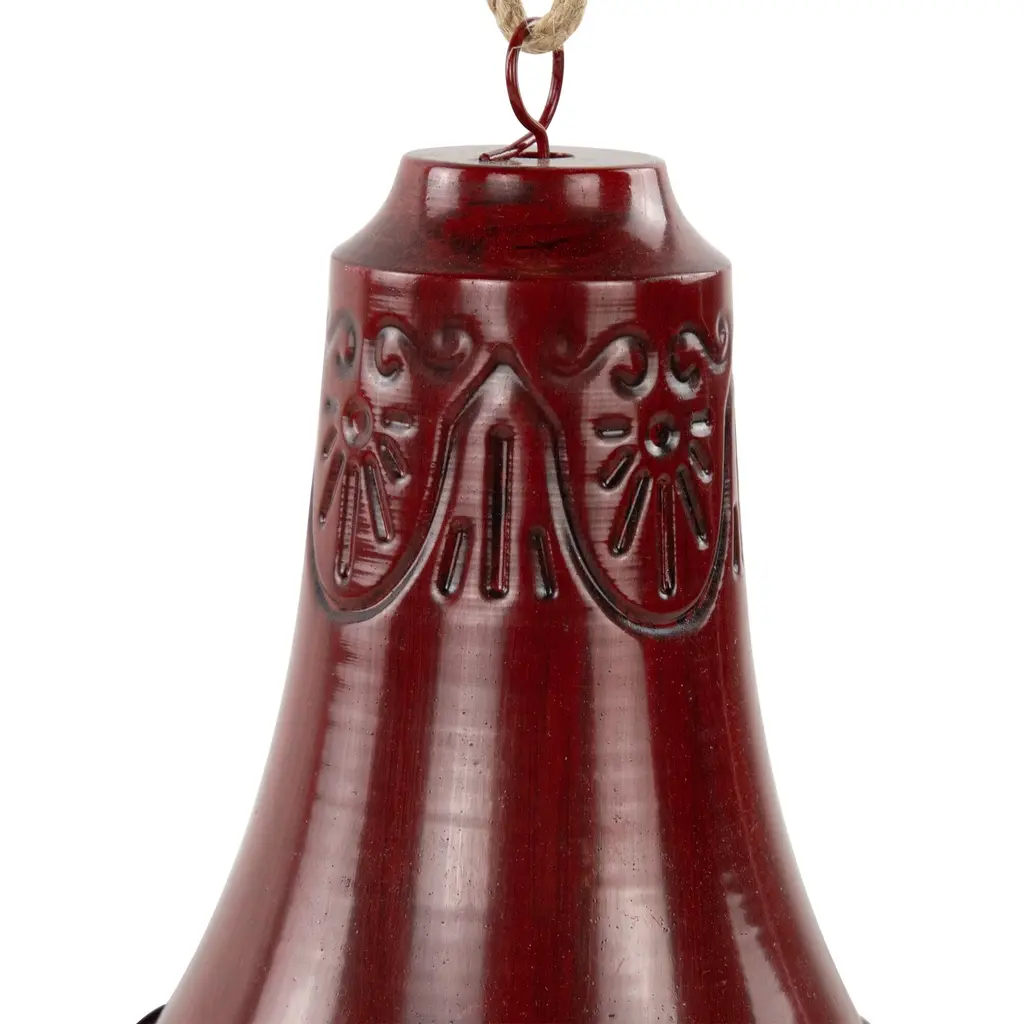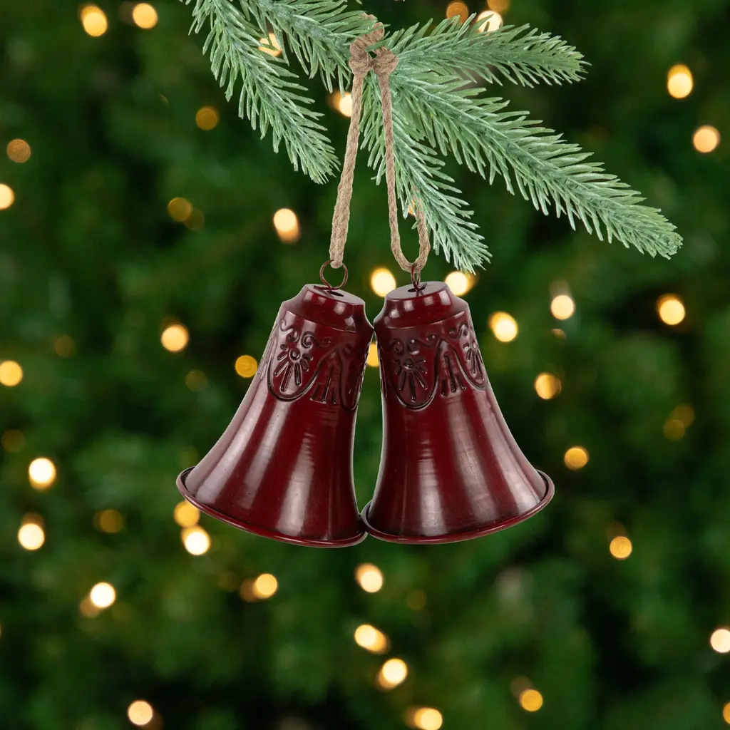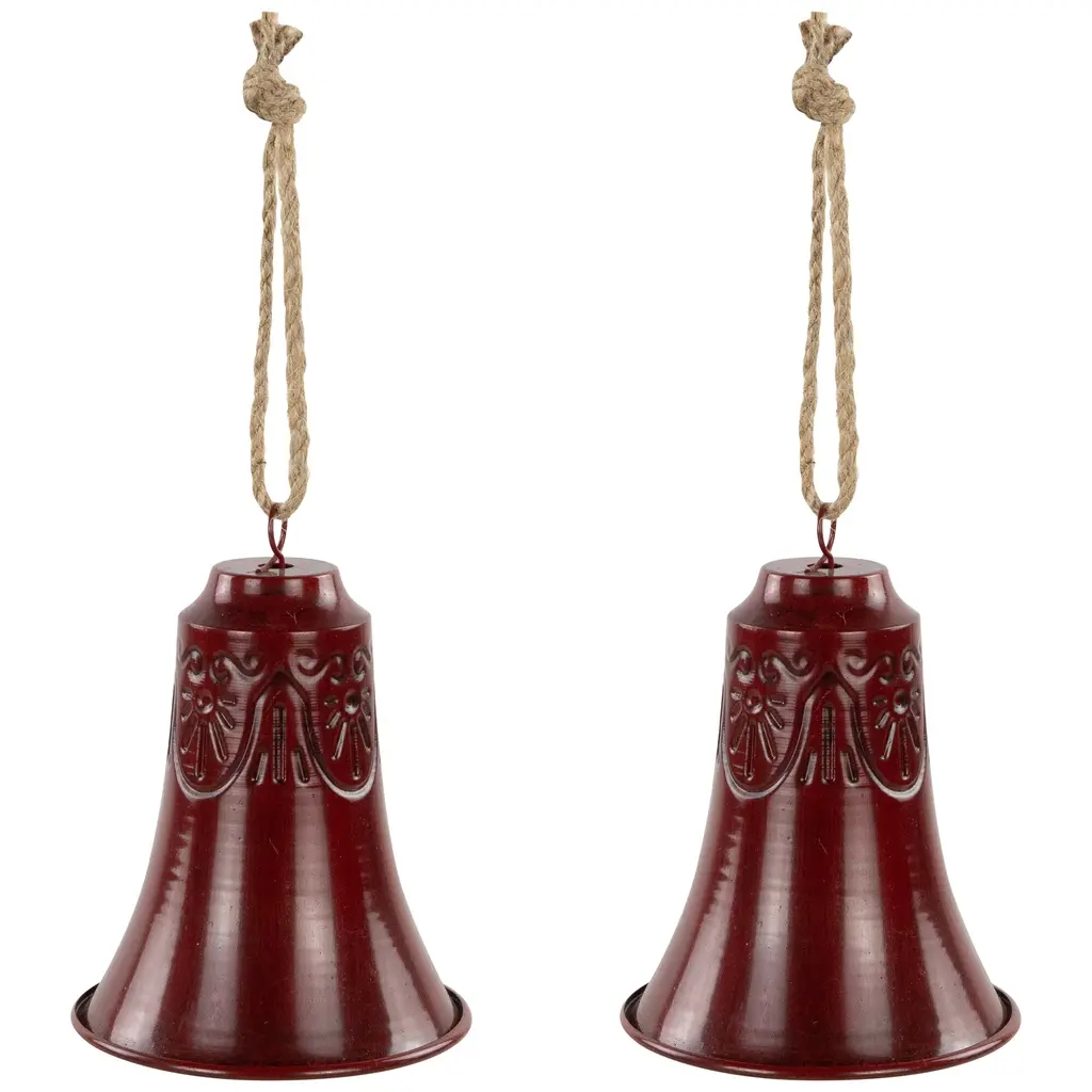 These burgundy red bells add traditional charm to your holiday tree Designed with ornamental embossed swirls, they add a festive touch to your home's Christmas decor. Perfect for hanging on large Christmas trees with the included jute cords or as a holiday centerpiece. Enjoy the season with these timeless and sophisticated bells. Features: Set of 2 Christmas bell ornaments Metal bells with a distressed brushed red finish Elegant embossed scroll accents Each bell includes a jute rope for hanging Display together or separately on mantles and Christmas trees Indoor use recommended Dimensions: 6" high x 4.5" diameter Material(s): metal/jute