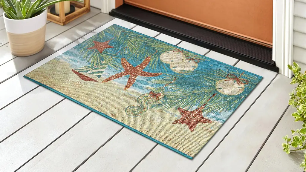 The Esencia Coastal Ornaments Indoor/Outdoor Mat features red, gold and ivory sea life inspired ornaments dangling from a pine bough on a beachy background.