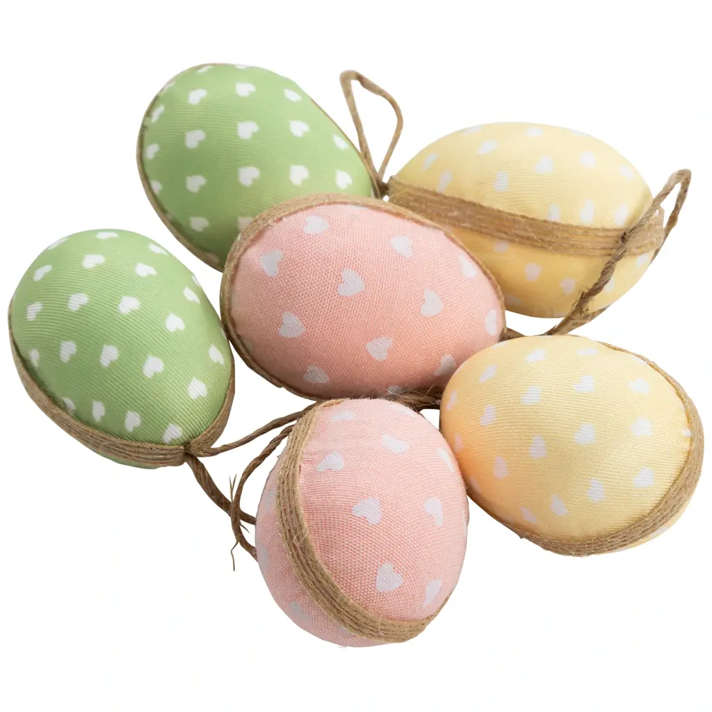 Celebrate the joy of Easter with this set of hanging Easter eggs. This set of eggs will add a touch of springtime magic to any room. They are designed in pastel-toned pink, yellow, and green hues and come with heart accents. Each egg features a natural jute twine cord for hanging. The set comes neatly packaged in a rustic kraft box. Whether you hang them from a branch, arrange them in a decorative bowl, or use them in your Easter crafting projects, these Easter eggs are sure to bring warmth and a sense of renewal to your holiday decorations. Product Features: Pack of 6 hanging Easter eggs Pink, yellow and green eggs with heart accents Each egg has a wrapped jute twine accent Kraft box accented with a jute bow Each egg comes ready to hang on a jute cord For indoor use only Dimensions: Box: 2"H x 5.75"W x 5.25"D Eggs: 2" high x 1.5" diameter Material(s): foam/fabric/paper Note: Set of 6 includes; 2 green, 2 pink and 2 yellow eggs